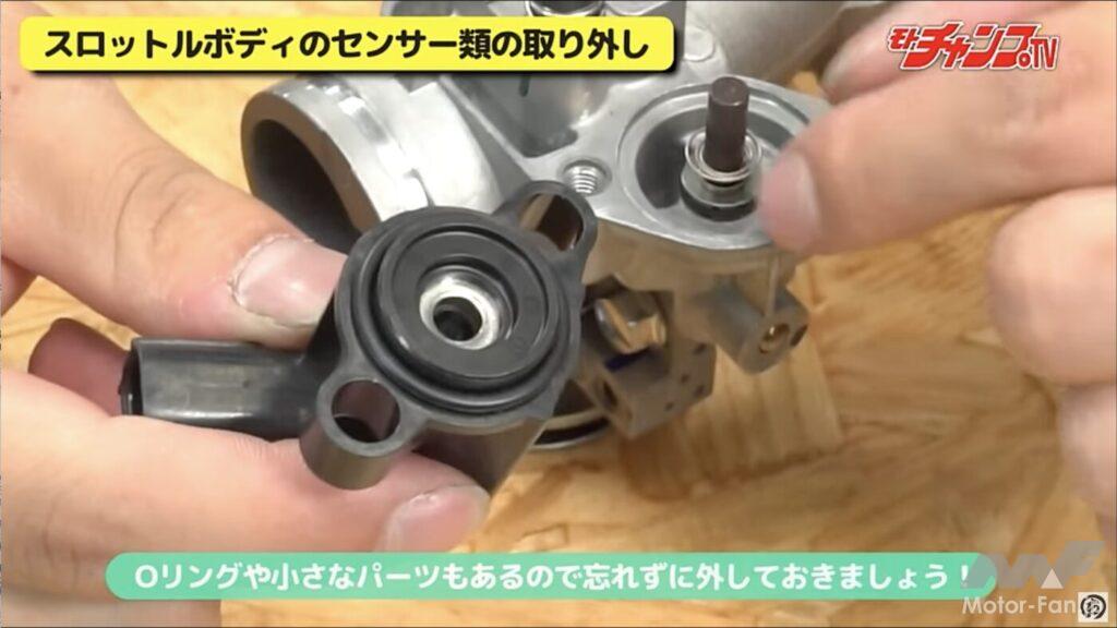 外したスロットルボディにもセンサーが装着されている。これらはSP武川製に移植して再使用することになるので、純正スロットルボディからセンサーなどを取り外していこう。センサーにはOリングが使われているので、こちらも再使用するから紛失には要注意だ。