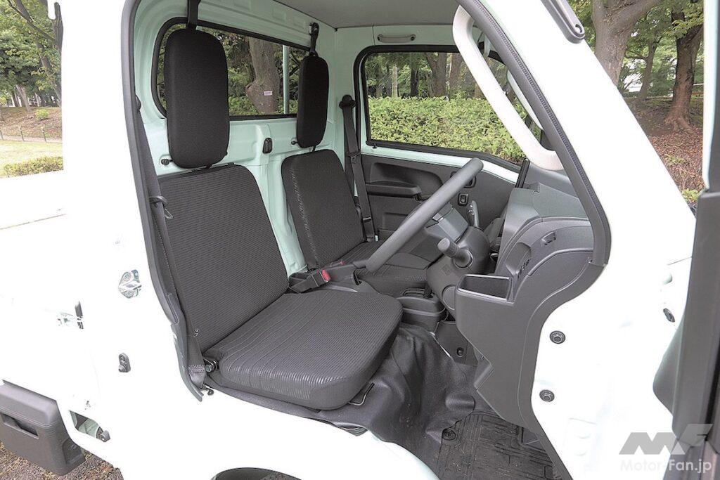 軽トラックは軽商用バンに比べると、1回の走行距離が短く、乗り降りを頻繁に繰り返す。そこで座面も、座り心地より身体が滑らかに動くことを重視している。エンジンは自然吸気だが、乗用車よりも実用回転域の駆動力が高い。トランスミッションは、軽トラック用に開発された無段変速式のCVT。効率の優れた回転域を保てるから、動力性能に余裕が生じて実用燃費も向上する。ノイズも抑えられる。