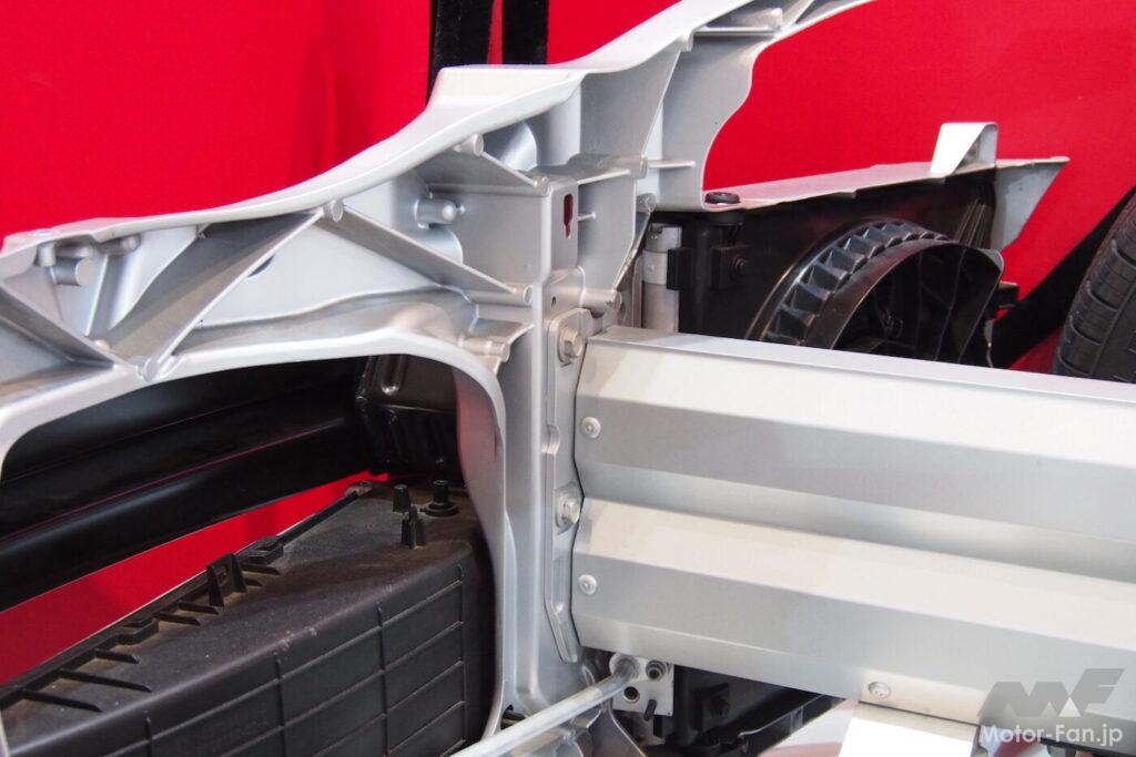 【写真02】は「モデルS」のフロント部分だ。前輪タイヤの内側にあるフロントサイドメンバーはアルミ材の8角柱を上下2段に配置し【写真03】、ラジエーターサポートは大物のアルミ鋳造(ダイキャスト)部品であることがわかる。フロントサスペンションのダンパートップマウントはアルミ鋳物製で左右をアルミ材で連結した構造【写真04】。ボディ剛性の高さはこうした構造が理由である。
