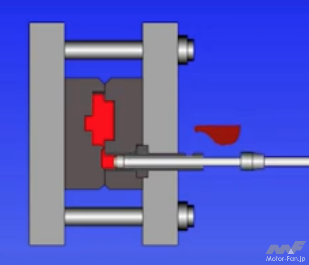 溶けた素材を金型に閉じ込めて成形する方法は樹脂でも鉄でもアルミでも使われる。その原理は【写真13】であり、金型の隅々まで均一に素材行き渡らせ、成形中は金型内の温度を「どこでもほぼ同じ」になるようコントロールする。そのために冷却水の水路を複雑に這わせている。【写真09】に見えるホース類は冷却水の行き/帰りの通り道である。
