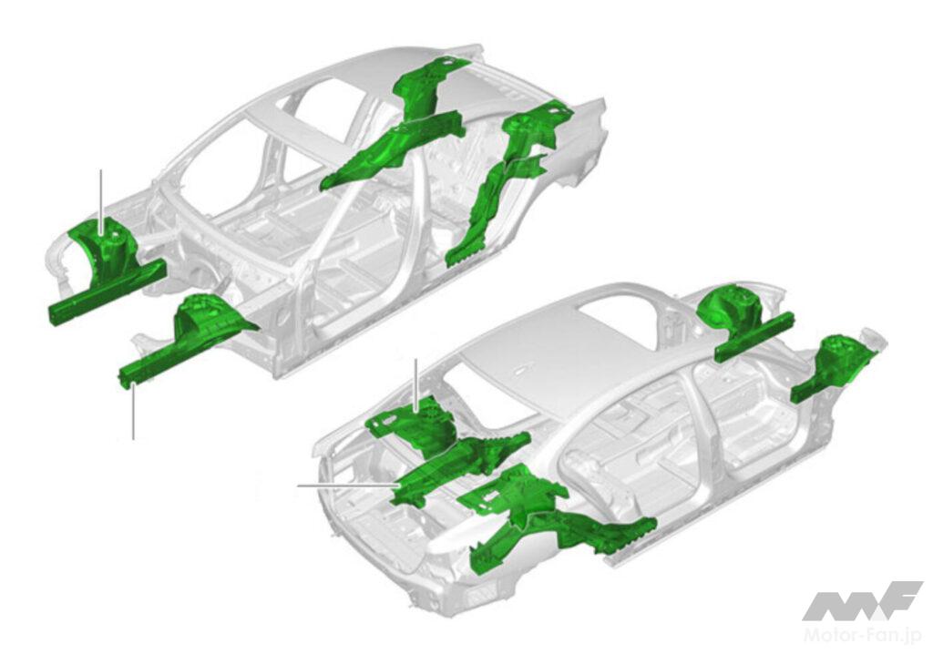 ただし、駆動輪まわりを左右一体鋳物で作ると「ボディが硬くなりすぎてハンドリングに影響が出る」と、BMWのエンジニアから聞いたことことがある。BMWはフロント全体をアルミ鋳物と押出材、薄板の組み合わせで作ったE60型(2003年)5シリーズを、その次のF10型(2009年)ではアルミ鋳物と鋼材に変え、G30型(2016年)では4輪のストラットタワー部分だけをアルミ鋳物にして、左右は鋼板でつなぐという設計になった【写真14】。緑色の部分がアルミ鋳物だ。G30設計時点では「左右をつないだ鋳物はメリットが少ない」と判断していた。