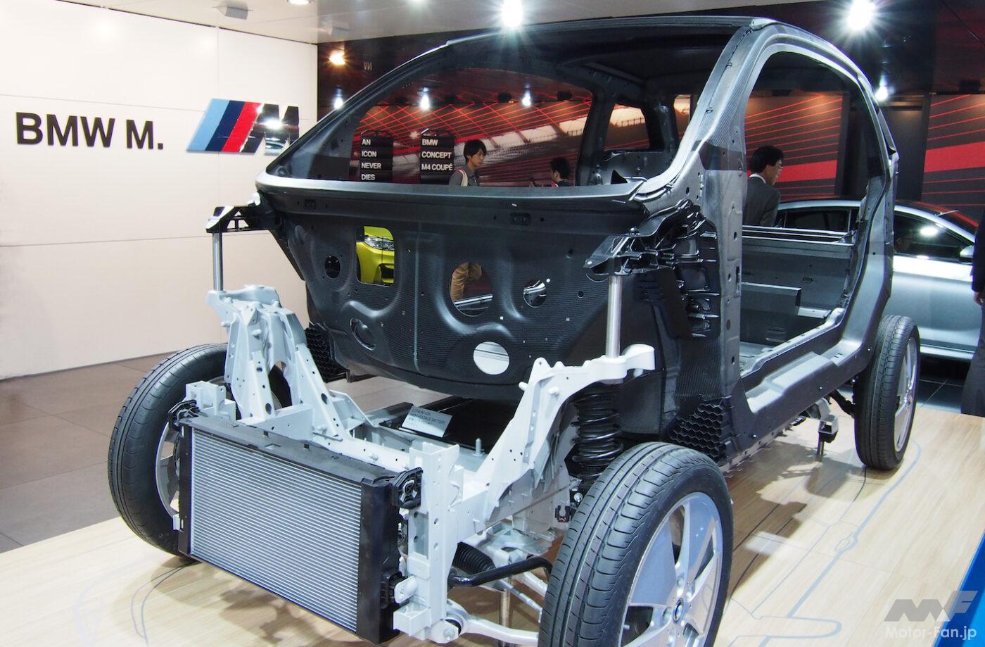 2013年発表のBMW「i3」は【写真11】【写真12】のようなアルミ鋳物のシャシー構造物とRTM(レジン・トランスファー・モールディング)という新しい手法の炭素繊維(カーボン)強化樹脂を使ったキャビンを組み合わせた。前面衝突の衝撃を軽減するための樹脂成型品【写真15】やフロントのアルミ製ストラットタワーとボディをつなぐアルミ鋳物ブラケット【写真16=実際には円柱状の部品は使われない】など、斬新な設計だった。テスラがメガキャスト部品を採用するのは、これらの後である。