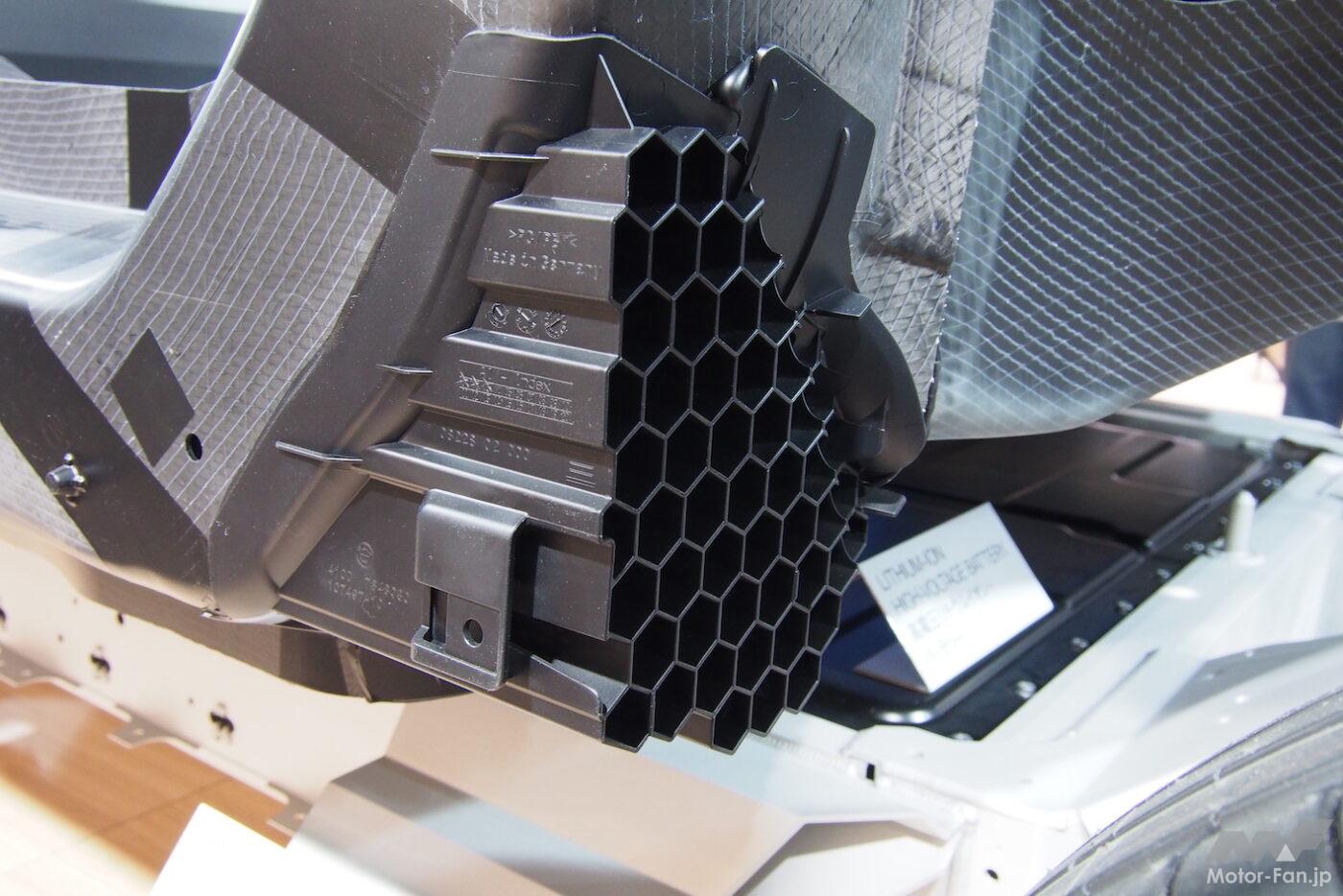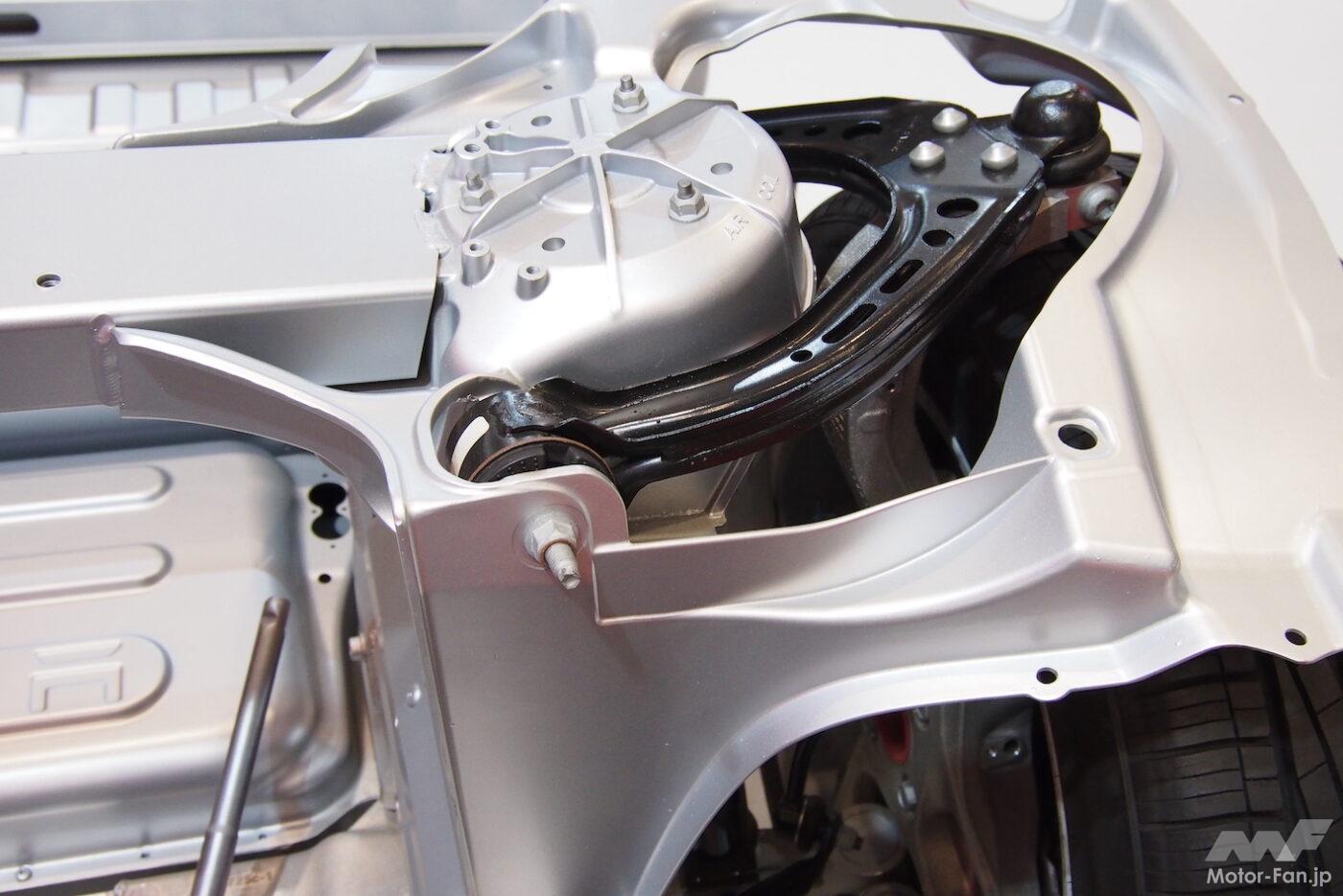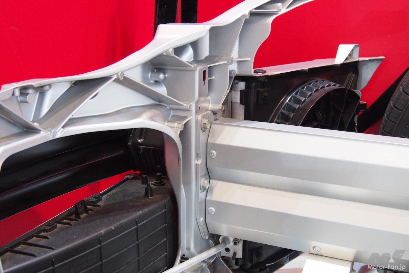 【写真02】は「モデルS」のフロント部分だ。前輪タイヤの内側にあるフロントサイドメンバーはアルミ材の8角柱を上下2段に配置し【写真03】、ラジエーターサポートは大物のアルミ鋳造(ダイキャスト)部品であることがわかる。フロントサスペンションのダンパートップマウントはアルミ鋳物製で左右をアルミ材で連結した構造【写真04】。ボディ剛性の高さはこうした構造が理由である。