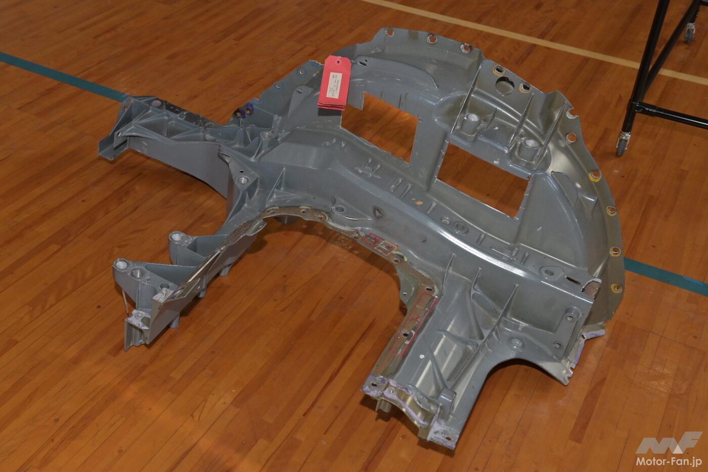 【写真01】はロータスが「エリーゼ」の次に市販した「エヴォーラ」のアルミシャシーであり、テスラ「ロードスター」はこの構造に似ている。断面の異なるアルミ押出材を線溶接、構造用接着剤、ボルト、リベットで留めていた。この構造は事故でクルマをぶつけると修復が困難であり、「エリーゼ」は前面衝突でバルクヘッド(車室前の隔壁)付近まで破壊が及ぶと修復不可能だった。