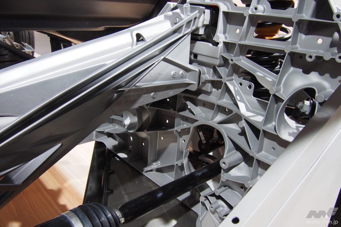 【写真07】と【写真10】からわかるように、金型を上下左右に引き抜く方法であり、補強リブの入れ方はすべて方向を揃えてある。【写真11】はBMW「i3」の後輪側面だが、これもアルミ鋳物製であり、テスラの鋳物と形状はよく似ている。車体後方から見ると【写真12】のようになっている。