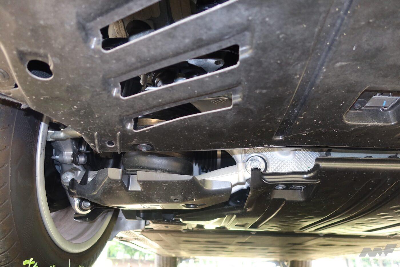 継ぎ目や段差がなく、開口部も最小限に抑えられた特徴的なフロントマスクのおかげで、EQS SUVはひと目でEQシリーズ、すなわちBEVだとわかる。開口部を極端に小さくしたホイールデザインは空気抵抗低減のためだ。床下を覗くと樹脂性のパネルで覆われてフラットになっており、ここでも空気抵抗低減に気を使っているのがわかる。Cd値(空気抵抗係数)は0.26だ。前後のサスペンションアーム/リンク類はアルミを多用しており、必要な強度/剛性を確保しながら軽量化に気を配っている様子が伝わってくる。