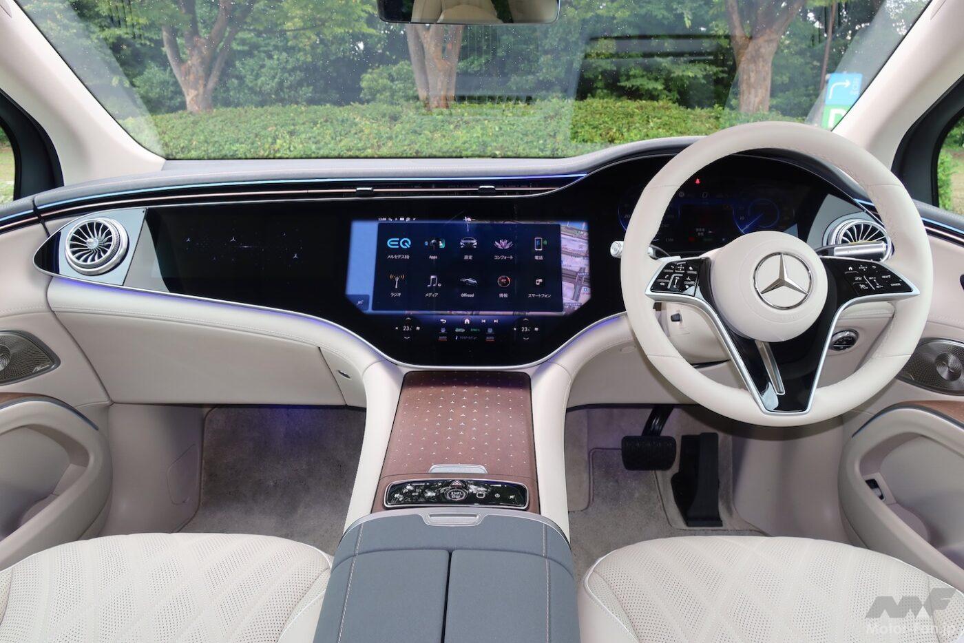 試乗車はデジタルインテリアパッケージのオプション(121万円)を装着しており、先進デジタル感が強いMBUXハイパースクリーンを備える。よりスポーティなEQS 580 4MATIC SUV Sports(1999万円)には標準で装備される。コックピットディスプレイ、有機ELメディアディスプレイ、有機ELフロントディスプレイ(助手席)を1枚のガラスで覆ってワイドなスクリーンを構成。最先端の新しいクルマに乗っている感が味わえるのは、多分にこのスクリーンの影響が大きい。