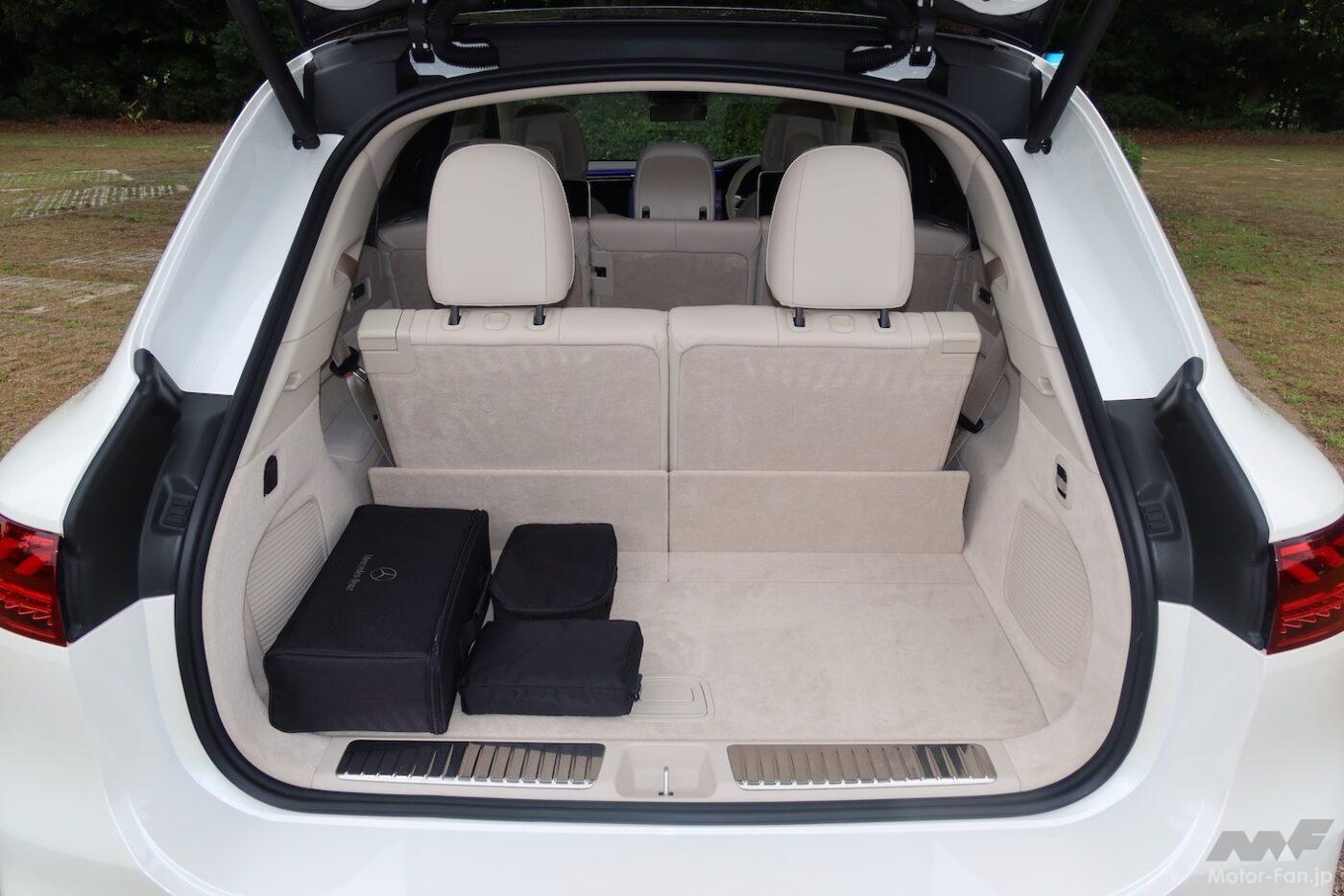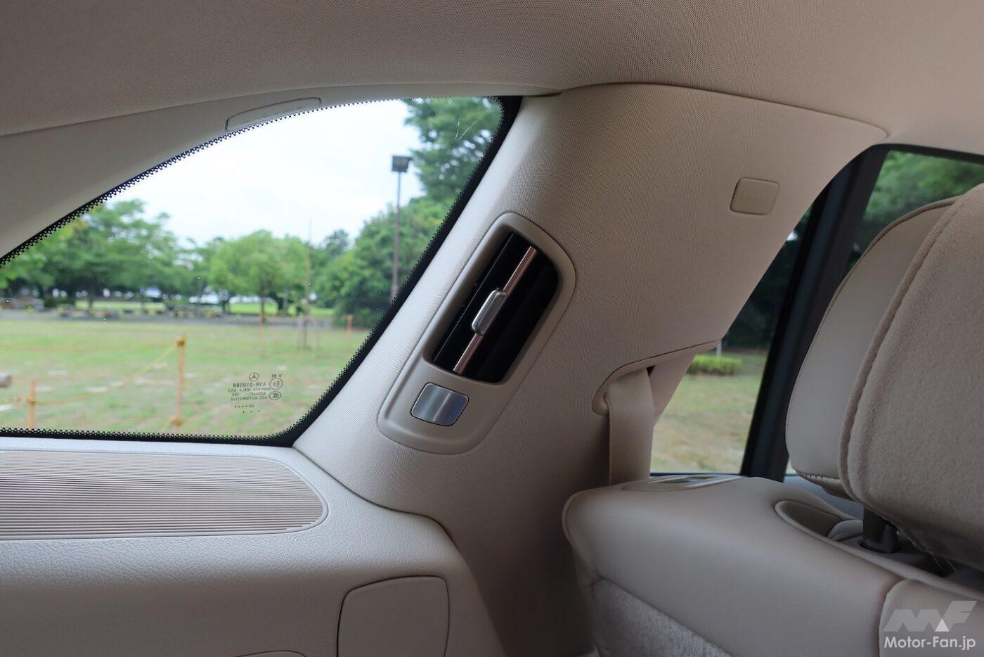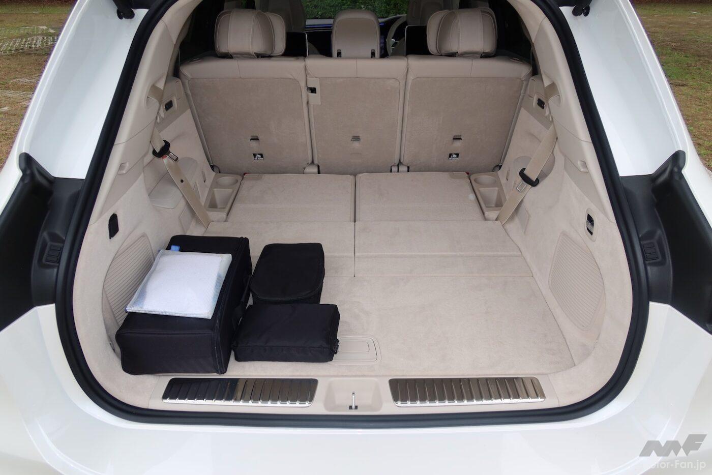 ユーティリティ面での最大の違いは、EQS SUVが3列目シートを備えていることだろう。さすがにスペースはミニマムで乗員の体格を選ぶが、専用のエアコン吹き出し口は付いているし、シートヒーターも装備。カップホルダーはもとよりUSBポート(タイプC)まで設置されており、快適性・利便性への配慮が行き届いている。2列目シートの肩口にあるスイッチを操作すると1列目と2列目が連動して前方にスライドし、3列目への乗り降りを助けるイージーエントリー機能が付いている。そのため、乗り降りの段取りに汗をかく必要はない。