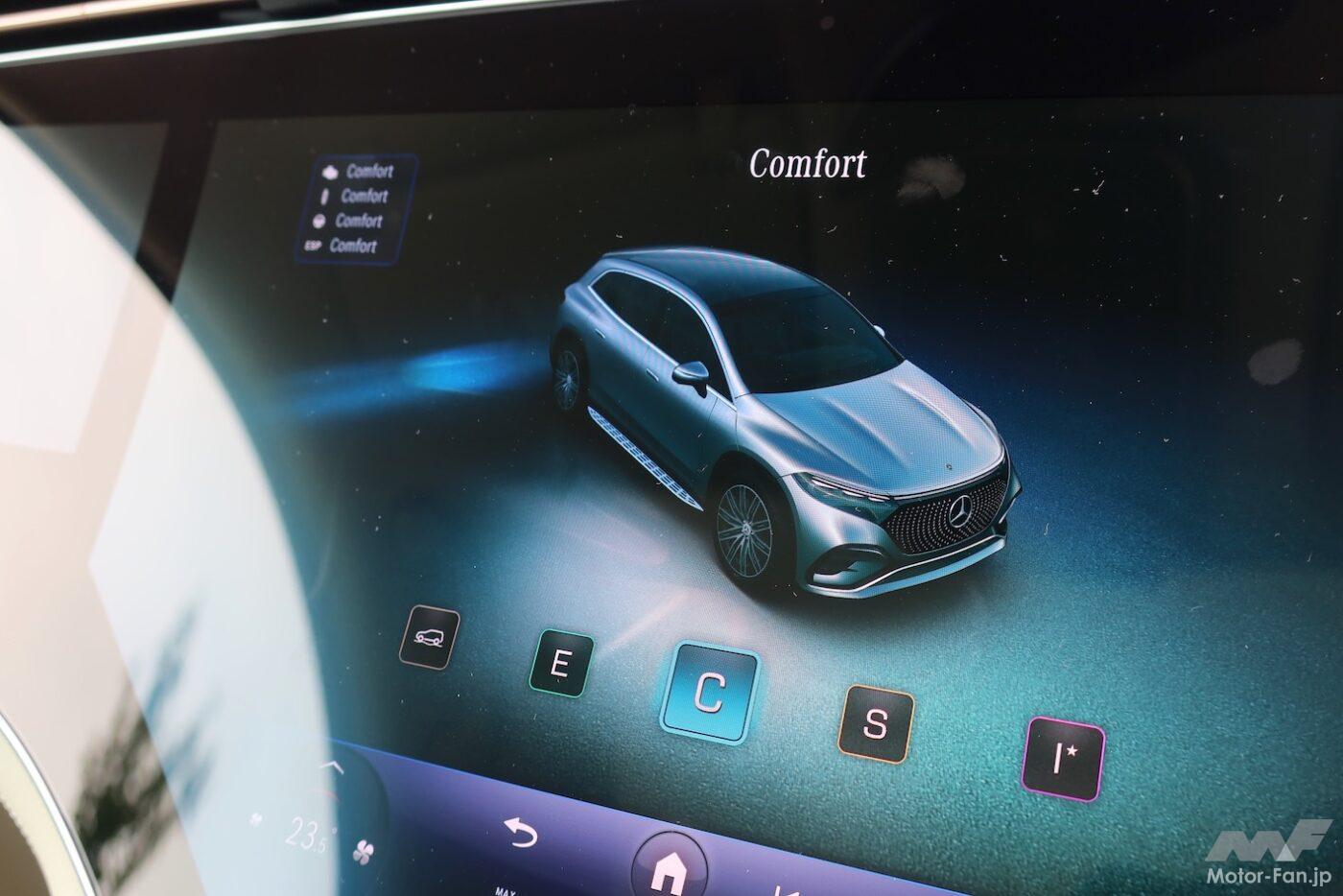 EQS SUVはADS+(減衰力可変ダンパー)とエアサスペンション(コイルスプリングの代替)を組み合わせたAIRMATICを標準装備している。AIRMATICはセルフレベリング機能を備えており、乗員や荷物の重さに関係なく地上高を一定に保つほか、ドライブモードでComfortとSportを選択した場合は110km/hを超えると10mm、または15mm車高を下げて空気抵抗を低減すると同時に走行安定性を向上させる仕掛け。80km/h以下になると元の車高に戻る。60km/h以下ではボタン操作により25mm車高を上げることが可能だ。