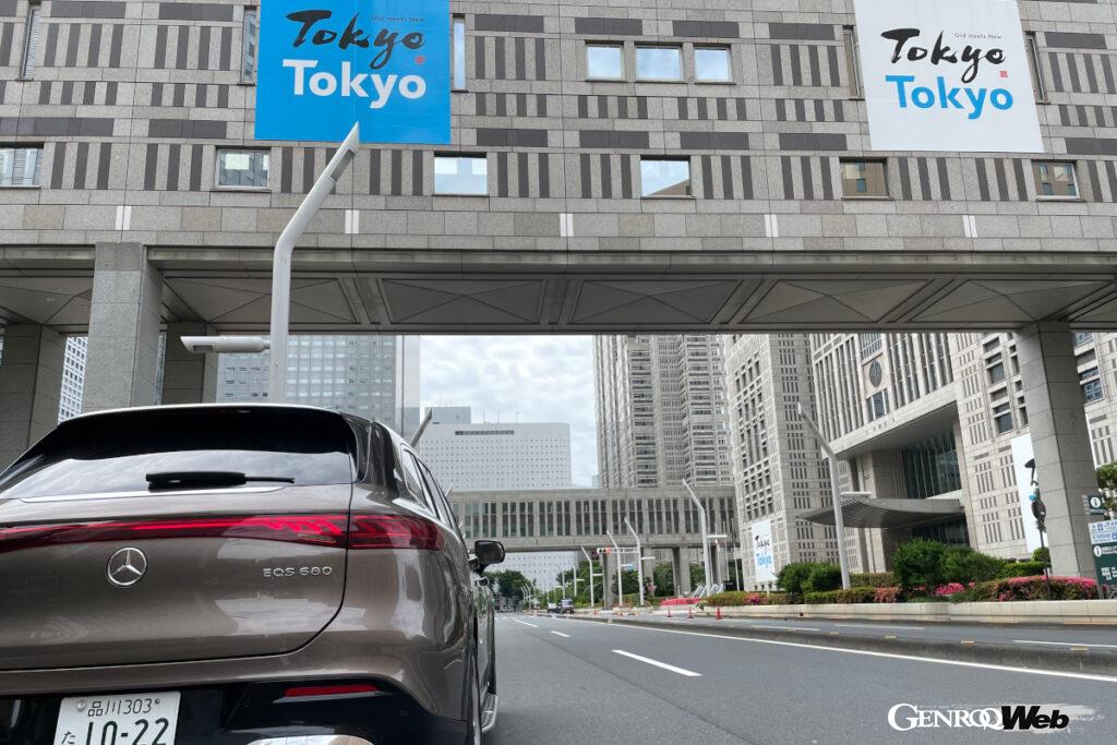 週末の始まった朝、混み始めた東京・環七をEQS 680 SUVで走り出すと、全長5135×全幅2035×全高1725㎜という圧倒的ボディが、まるで車の方から手の内に収まって来るように扱いやすい。他の車が近づいてこないからではなく、低速域での小回りと中高速域でのスタビリティを高めるリヤ操舵の効きが自然で、もてあますことのない車両感覚の中で操れるのだ。