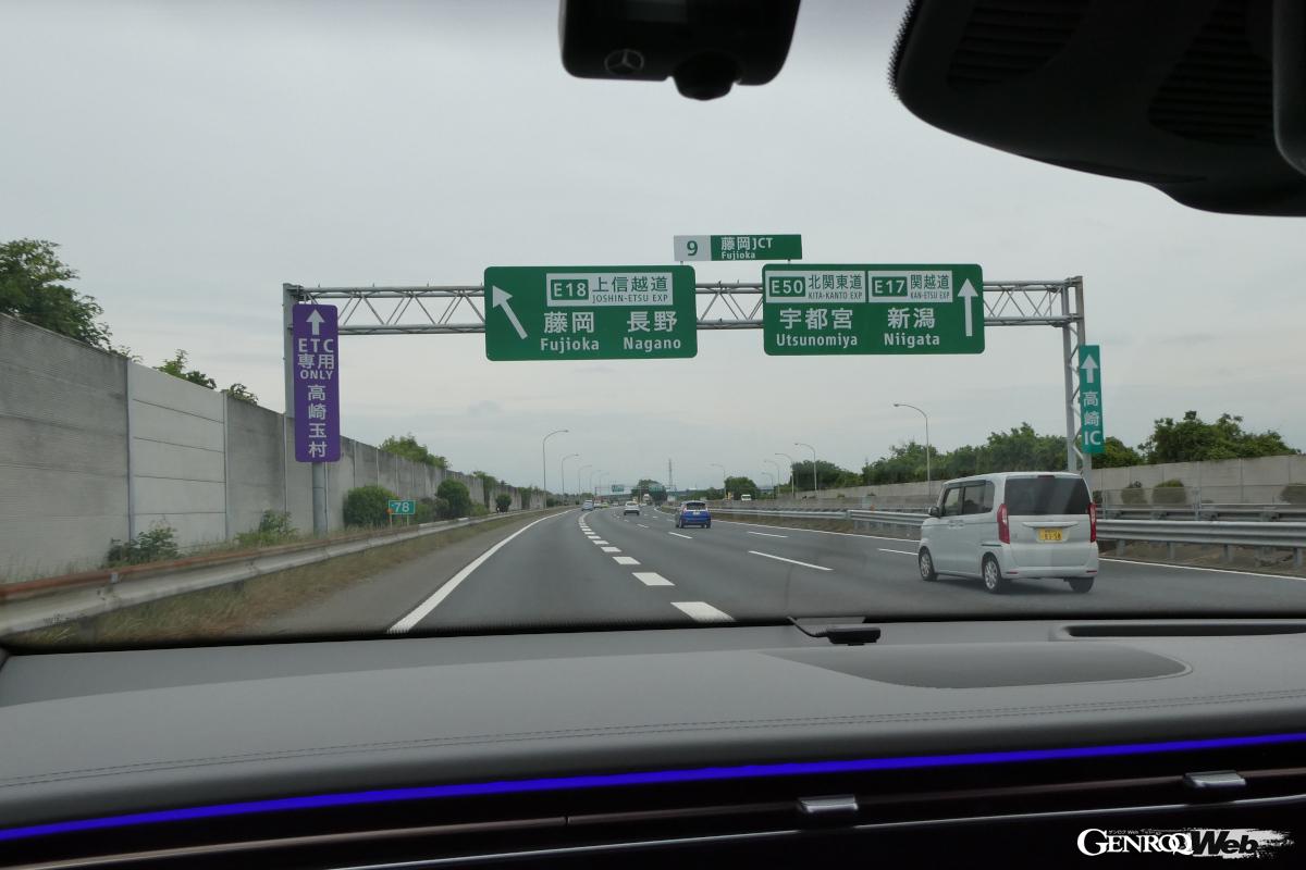 エコモードではアクセルの踏み込み初期が丸められ、やや電制のエアサスが制振性がコンフォートモードより控えめになる印象で、関越道のパッチ路面で上下に揺すられる心地はするが。でもホワイト基調の優雅なシートと、ピアノブラックにストライプの入った優雅なインテリアに包み込まれ、走行しながらマッサージ機能やらエナジャイジングコンフォート・プログラム各種を試していると、移動中に寛ぐという概念が、荒唐無稽な話ではないことをまざまざと実感させられる。