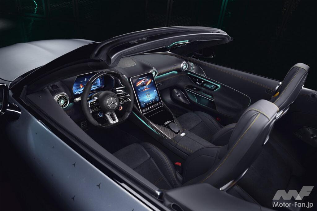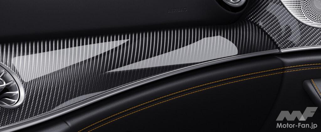 インテリアには、ナッパレザー/MICROCUT素材にイエローステッチを採用したAMGパフォーマンスシートや、AMGカーボンファイバーインテリアトリム、カーボンファイバーとMICROCUTを組み合わせたAMGパフォーマンスステアリングを装備し、さらにスポーティな世界観が表現されている。