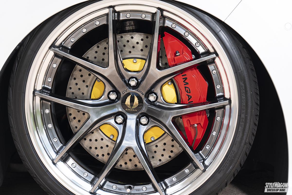 薄型ながらも存在感はしっかりで、重心の低いところにアイポイントを持ってこられるからロワード感を増せる点もこのエアロの魅力。一番低いところでも純正からの高さ延長は約35㎜に留められているため、装着後の取りまわしなども問題なしだ。
