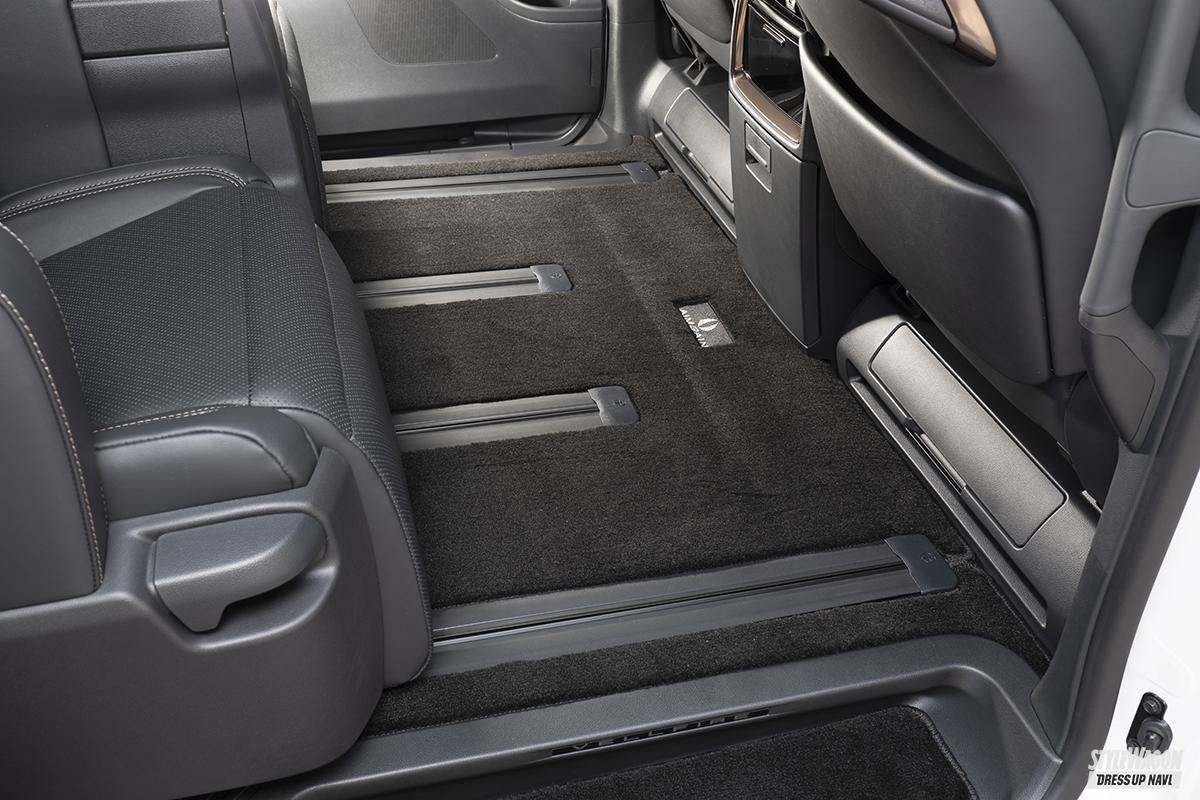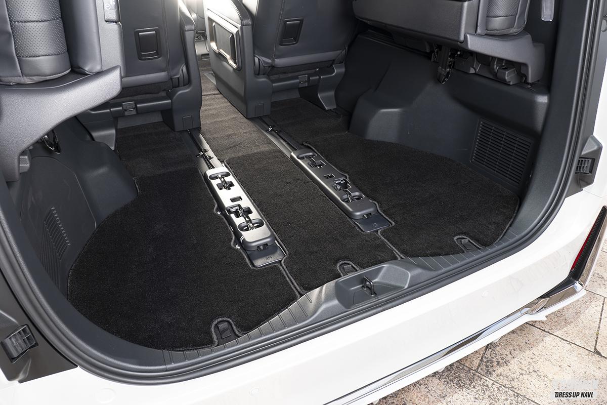 構成はフロントスポイラーとサイドスポイラー、リアスポイラーのみというもので、その造形はどれも薄型でシンプルなたたずまい。ただしフロントコーナーを流麗に立ち上げたジェントルなカナード形状を採用したり、リアの中央ボトムにはキレ味バツグンなディフューザーフィンを連ねるなど、ヴェルファイアらしいエッジ感をダイレクトに発揮できるのがポイントだ。