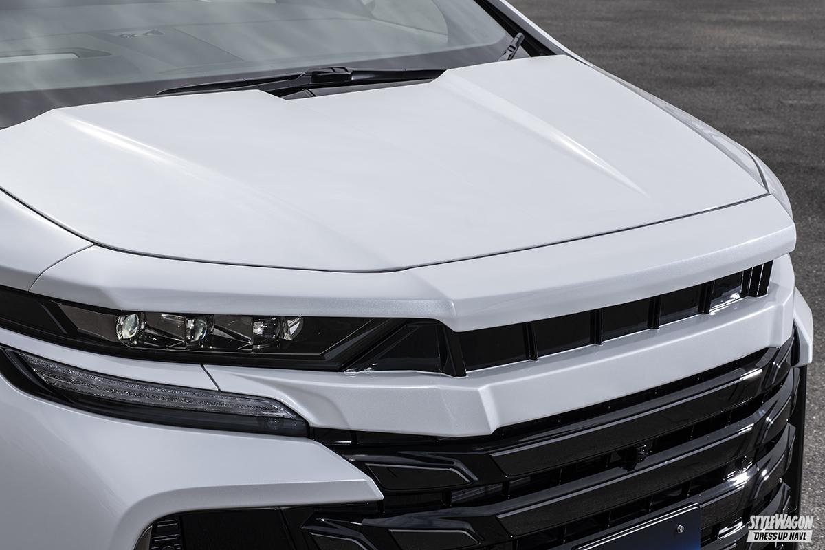 ヴェルファイアのみに設定されるのが、スッキリ感が魅力的なマークレス仕様のフロントグリル。クールのシンボル的パーツであるレーシングボンネットも用意されるほか、突出量が異なる2タイプのボンネットスポイラーもラインアップされており、フェイスの印象をキリッと引き締められる準備も万端。スポーツ志向で攻めるなら、必見。