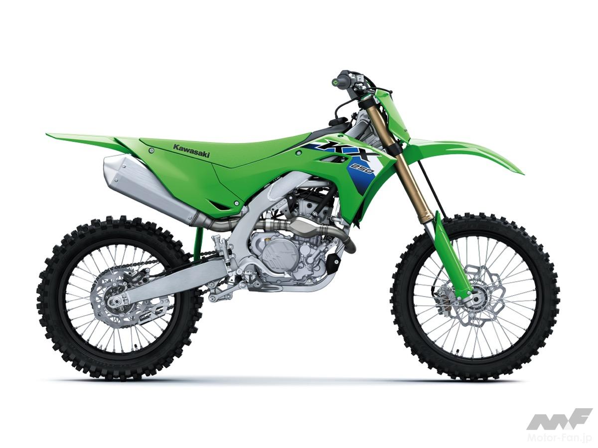 KX250はKXシリーズのパフォーマンスと排気量バランスを追求したモデル。エンジンには一軸一次バランサーを導入し、低速から高回転域までの滑らかさと振動抑制を実現。電デバイス類はKX450と同等の装備を持ち、操作性や安全性が高い。KX250Xはクロスカントリー向け仕様として、専用サスペンションとエンデューロタイヤ、サイドスタンドを備えたモデルだ 。価格はKX250が90万2,000円、KX250Xは92万4,000円(ともに税込)、KX450が108万9,000円、KX450Xが112万7,500円と設定されている。
