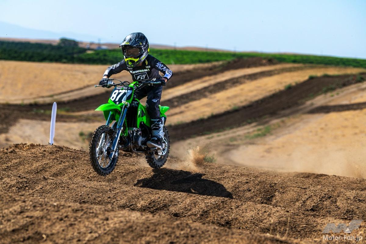 KX65は6速ミッション搭載の本格キッズ用モトクロッサーとして、64cc水冷2ストロークエンジンと前後伸側減衰・リアプリロード調整が可能なサスペンション装備。価格は390,500円(税込)だ 。KLX110R Lは111ccエンジンとオートマチックコンプレッションリリースを採用し、エレクトリックスターターやチェーンガイド、スロットルストッパーなど子どもの使用に配慮した安全設計が特徴。価格は29万7,000円(税込) 。