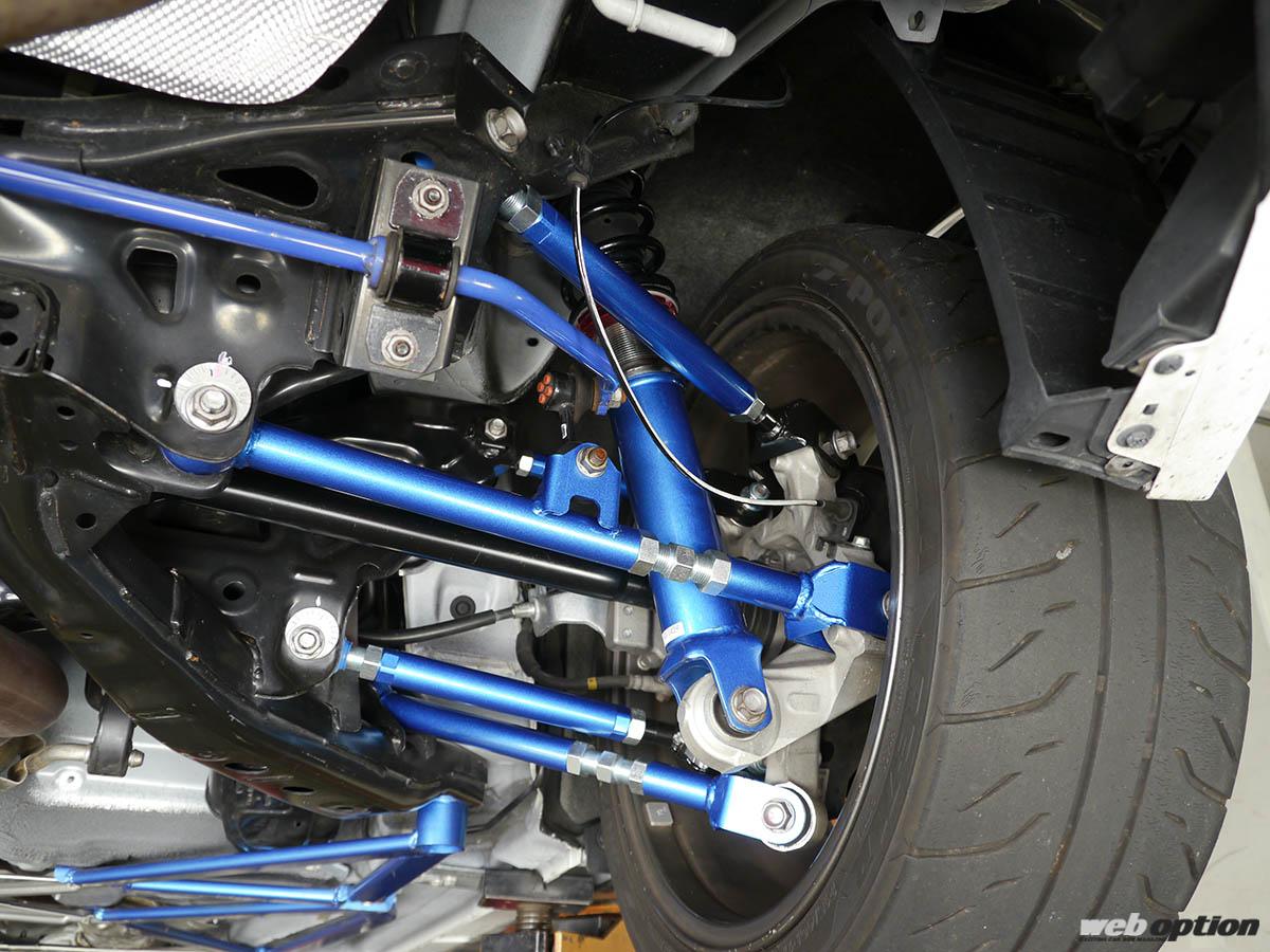 ターンバックル式の調整機構により、タイヤやコースに合わせたアライメントセッティングが可能になるリヤサスペンションのアーム類。強化ゴムブッシュやピロボールによるアライメント変化抑制効果により、コーナリングの安定性向上も期待できる。