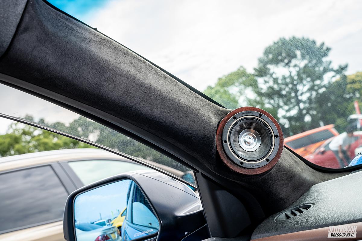 エアフォースのエアサスによる、見栄えするローダウンが印象的。エアサスタンク、コンプサッサーなどを収めるボックスはオーナーの自作で、横に十字レンチを収納するポケットまで備わっていた。サウンドにもこだわり、ドアのミッドのアウター化、ピラースピーカーをDIY設置している。