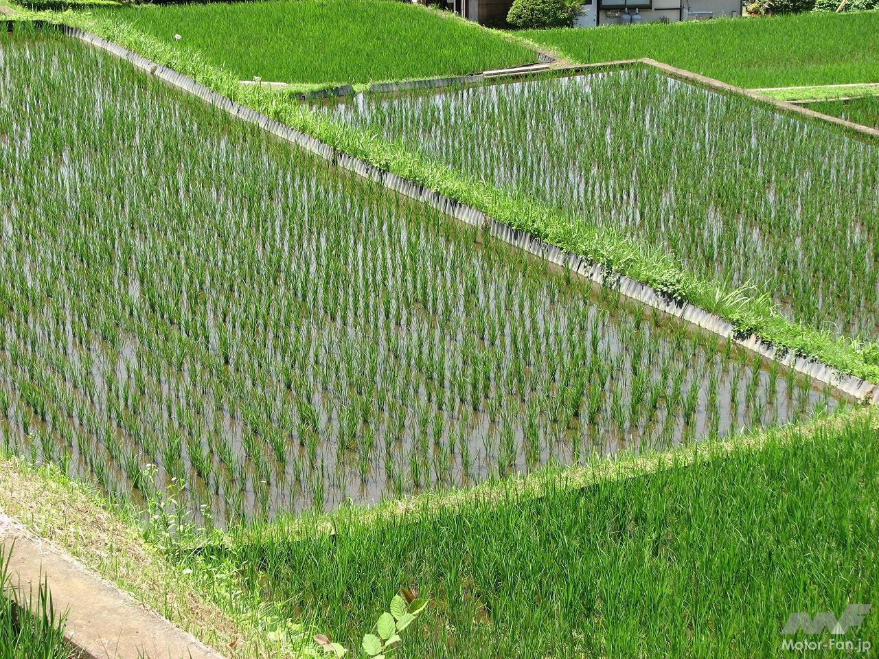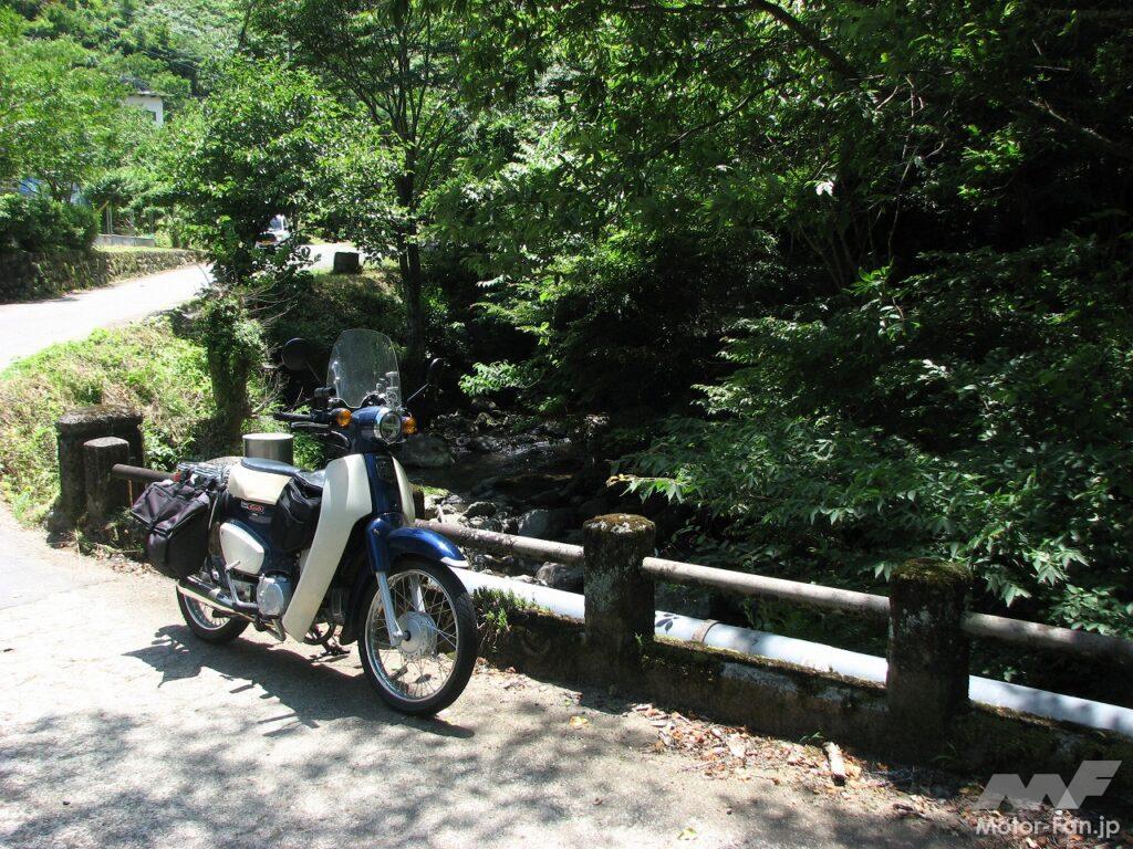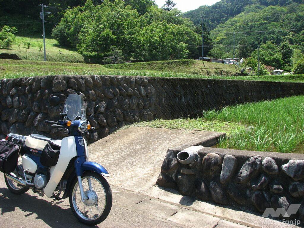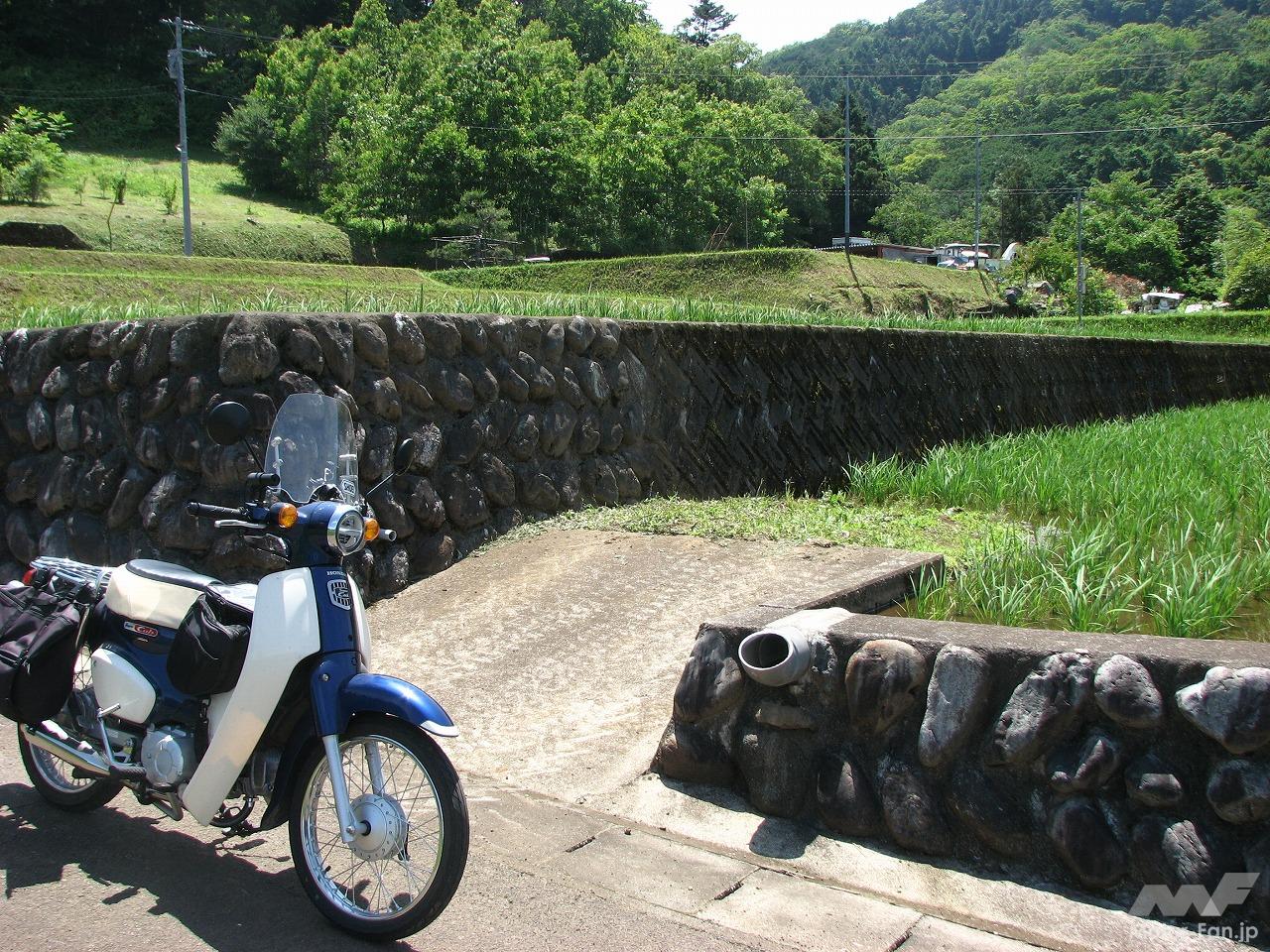 田植えが終わった棚田は緑の稲が風に揺れていて、実に長閑な里山風景を展開していました。農作業がすでに終わっていたのか、人影はまったくありません。ザ田舎という風景が政令指定都市相模原のすぐ隣にあるのですから不思議な感覚になります。そしてそんな風景にスーパーカブはよく似合います。