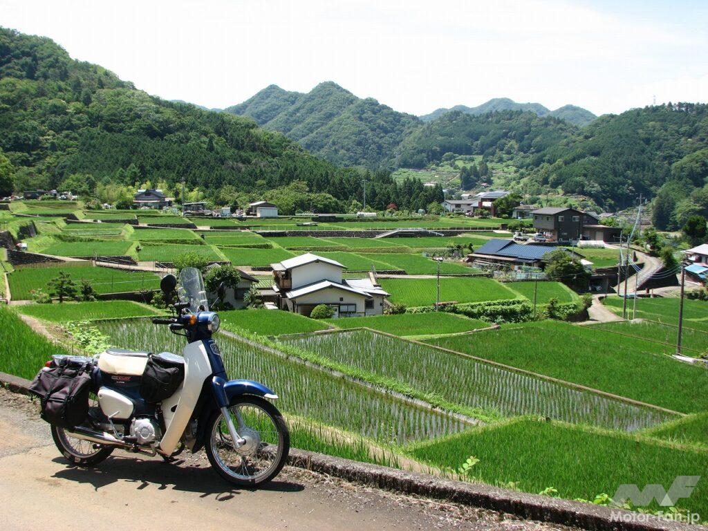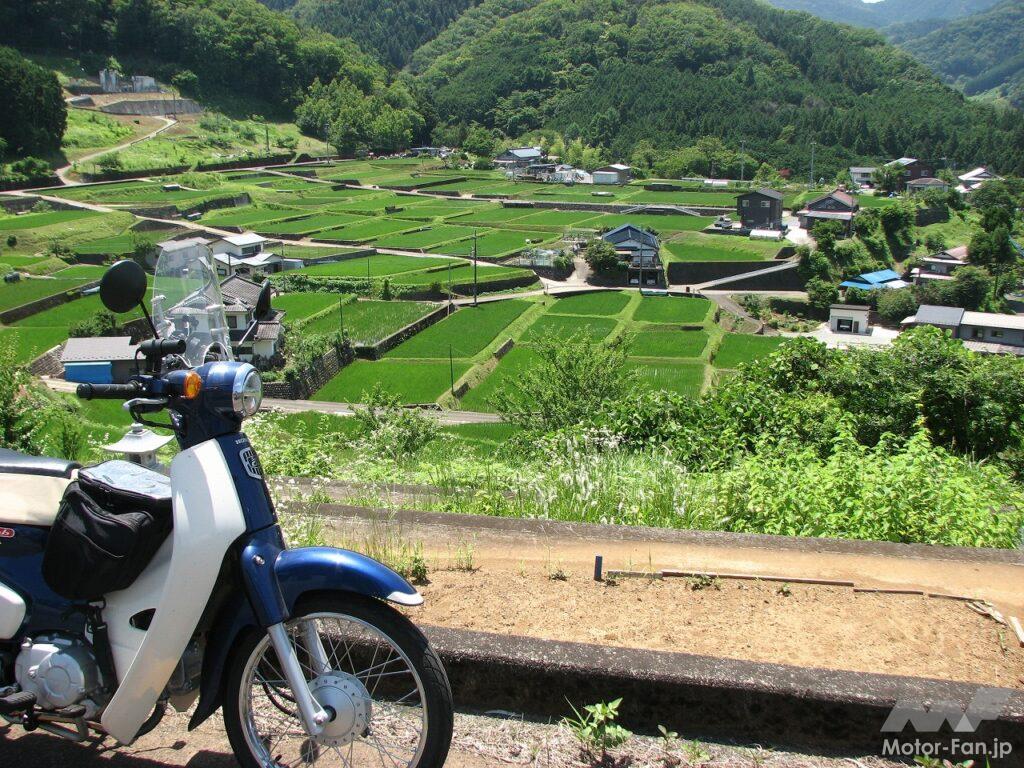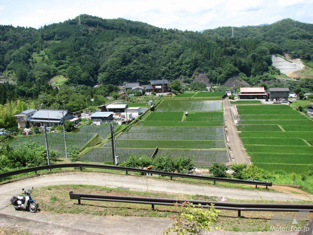 棚田に続く作業道を走り、風景を見晴らす場所にスーパーカブを止め麦茶でのどを潤していると、爽快な気分になってきます。