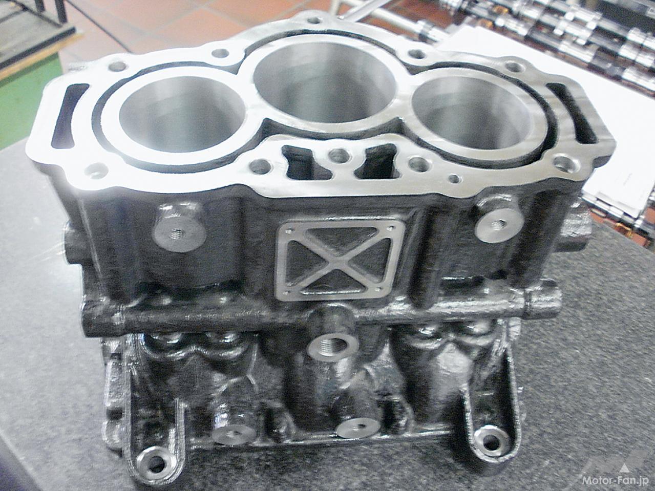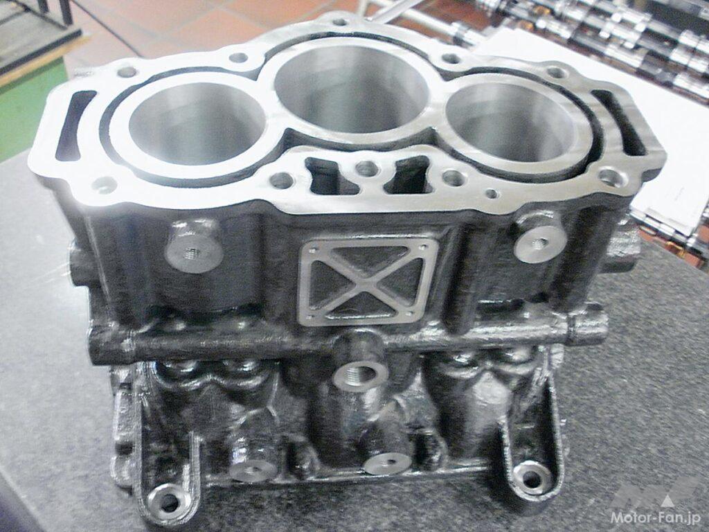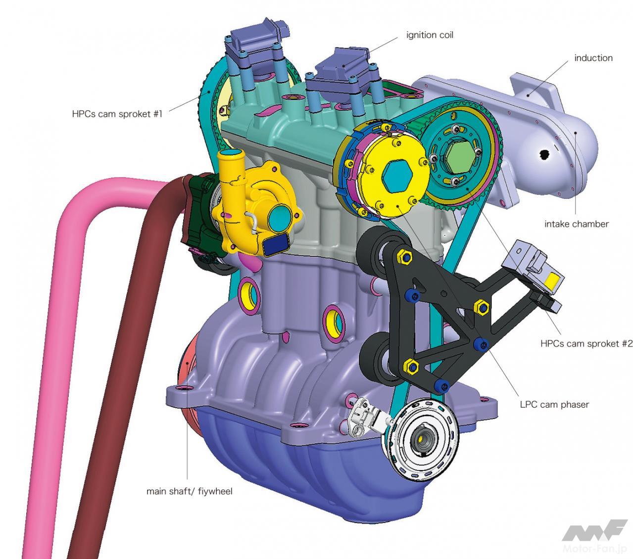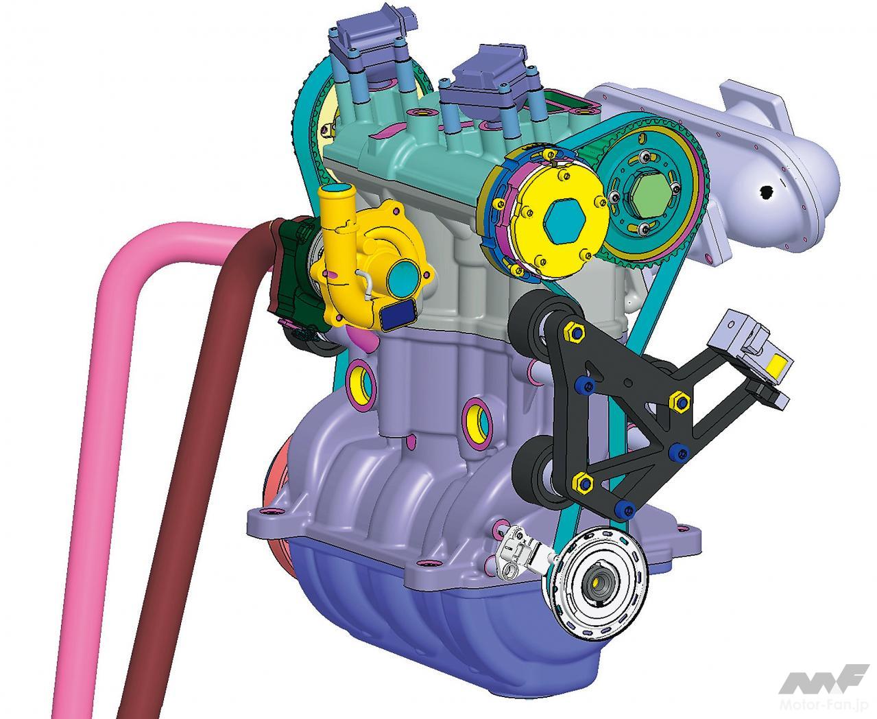 いっぽうで仕様をみれば、最大トルクは5000rpm、最高出力にいたっては7000rpmもの高回転で得られていて、どのような設計としているのか興味は尽きない。現在は2+1気筒構造のプロトタイプであり、さらなるステージとしては吸気ポートの2本化、エキゾーストバルブにスイッチタペットを用いることによるターボの高効率利用、そして直噴化などを将来展望として掲げている。これらを踏まえ、BSFCを215g/kWhとし、プロトタイプからさらに20%の軽量化、そしてリッター当たり出力として150hpをねらっている。