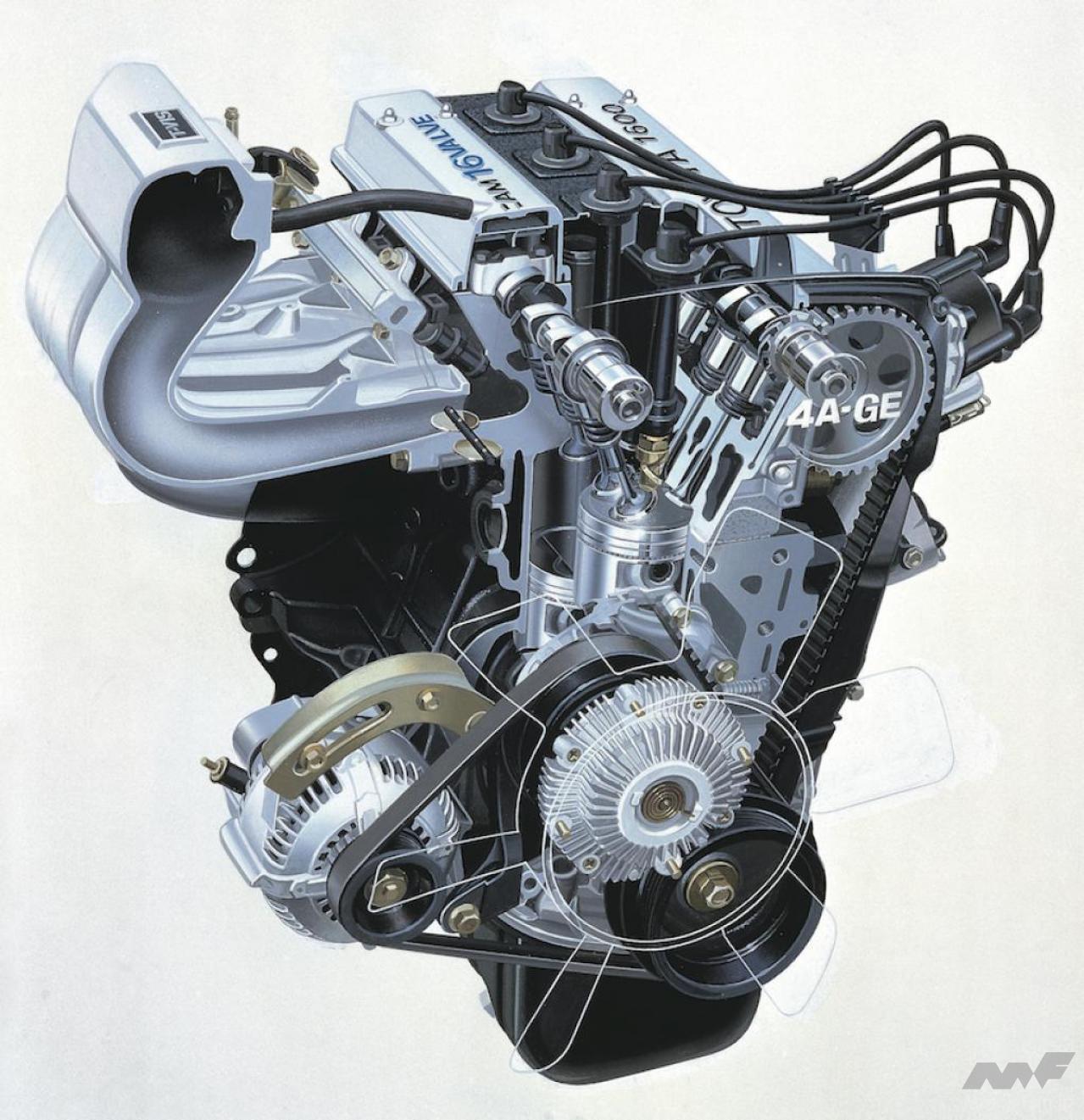 ちなみに2T-G型でこれだけのボアの拡大が可能であった背景には、純正オーバーサイズのピストンを使った補修が現在よりも頻繁に行なわれていたことから、ブロックの肉厚が余裕を持った設計になっていたという事実がある。これが後の世代の4A-G型では81mmのボア径に対し、ボアピッチは87.5mmでシリンダー間の肉厚は6.5mmしかなく、仮に3.5mmもボアを拡大すると、3mmの肉厚しか残らないことになってしまう。
