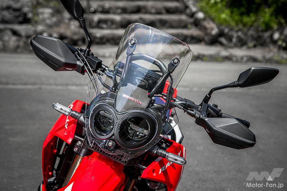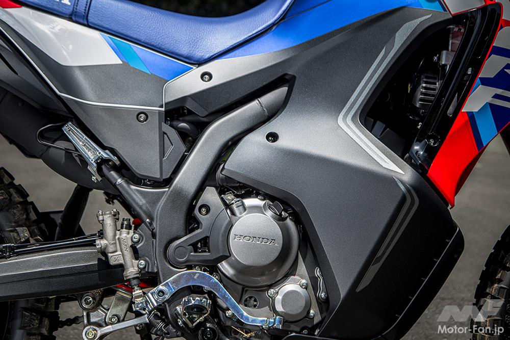 「CRF250ラリー」が、ホンダのオンオフロードモデルである「CRF250L」とプラットフォームを共有しているのはご存じの通り。その車体に異形二眼のLEDヘッドライトやそれを覆う大型スクリーン、12リットルの大容量燃料タンク、CRF250Lに対して2cm幅広い専用シート形状を採用するとともに、そのシートをラバーマウントして長距離走行時のライダーの疲労軽減を図っている。