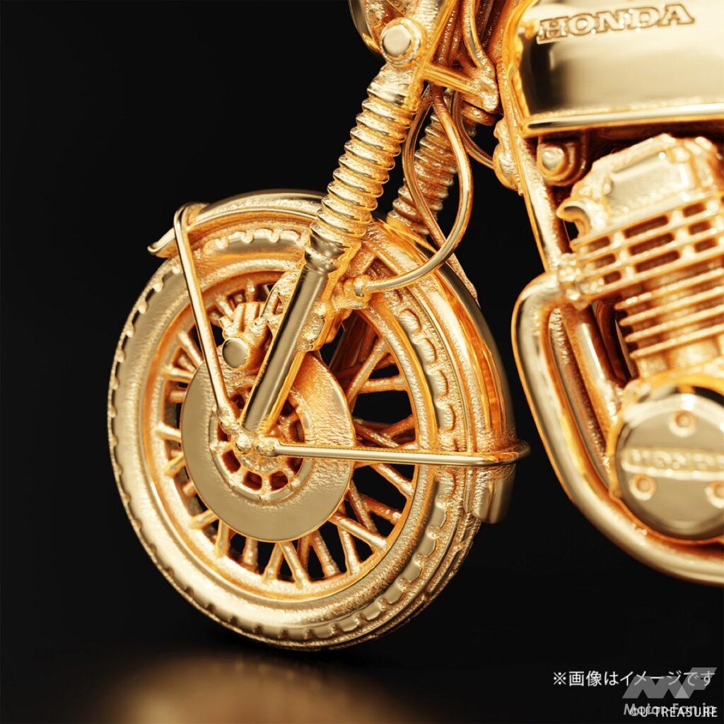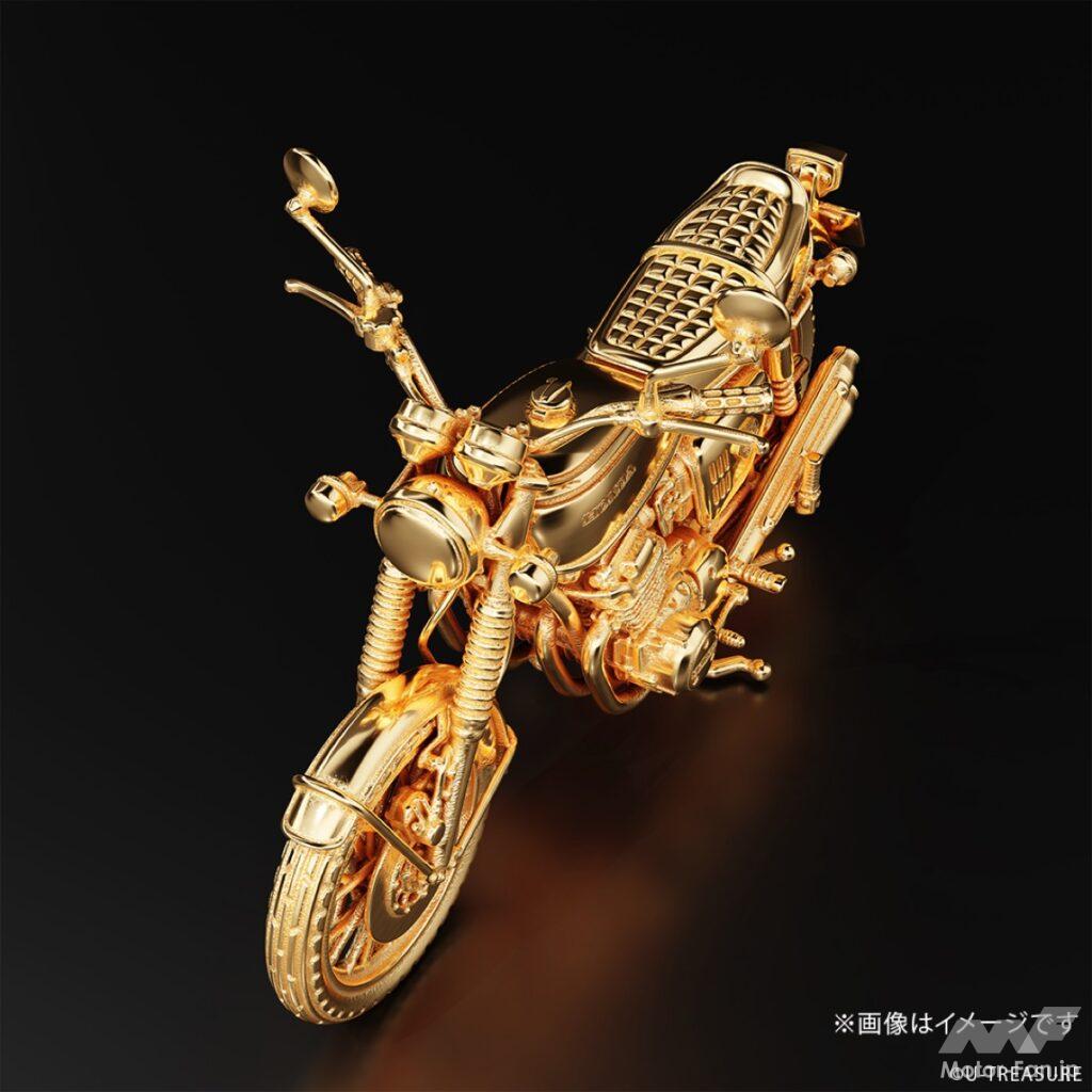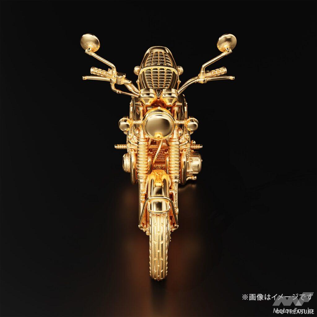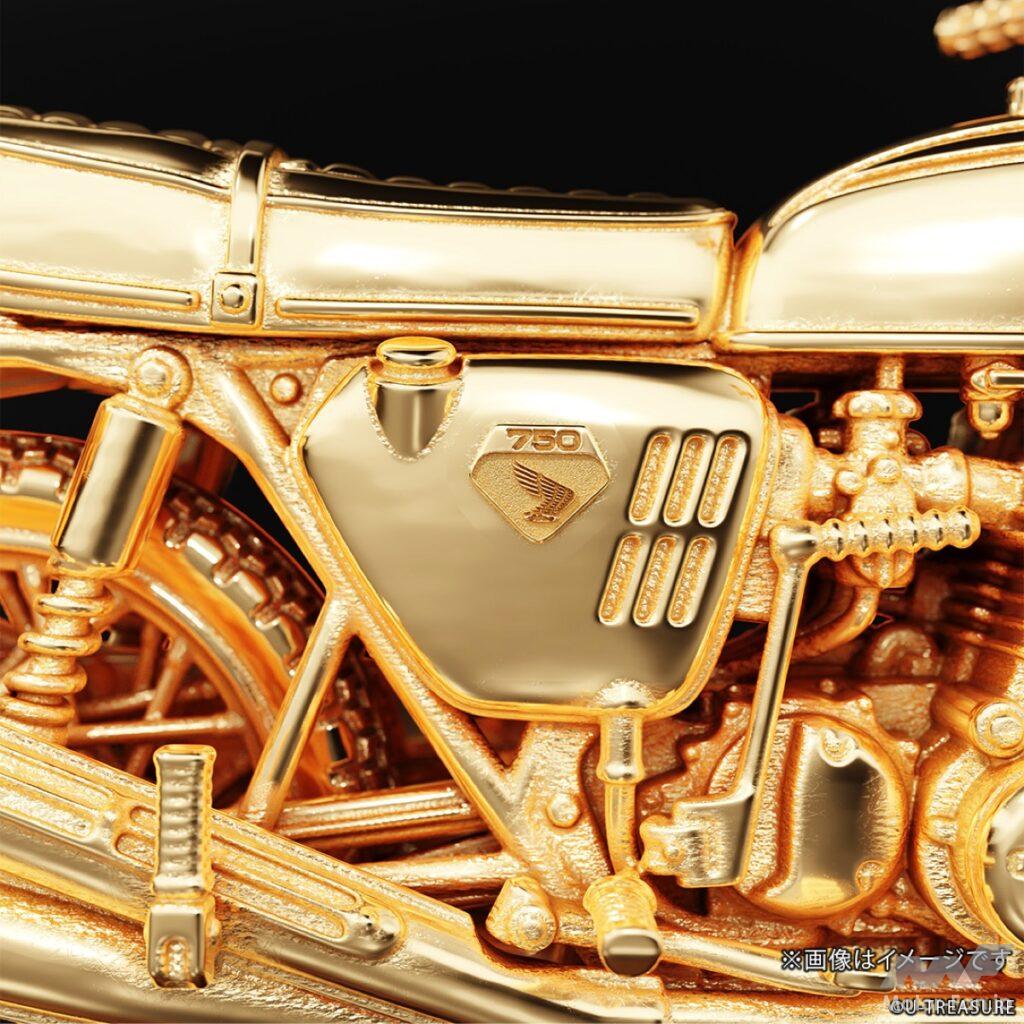 このフィギュアは、シルバー925(一部イエローゴールドコーティング/マット加工)を素材に使用し、ジュエリー職人が一部ずつ丁寧に仕上げた逸品。角張ったサイドカバー、ガソリンタンク、シート、フェンダー、フロントフォークといった主要パーツだけでなく、キャブレター、燃料コック、エアクリーナー、ワイヤー類などの細部まで、実車を徹底調査して忠実に再現している。
