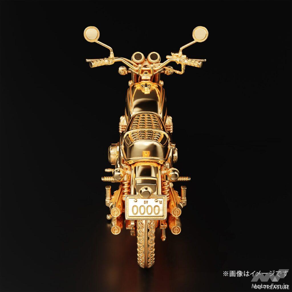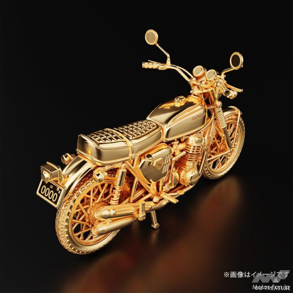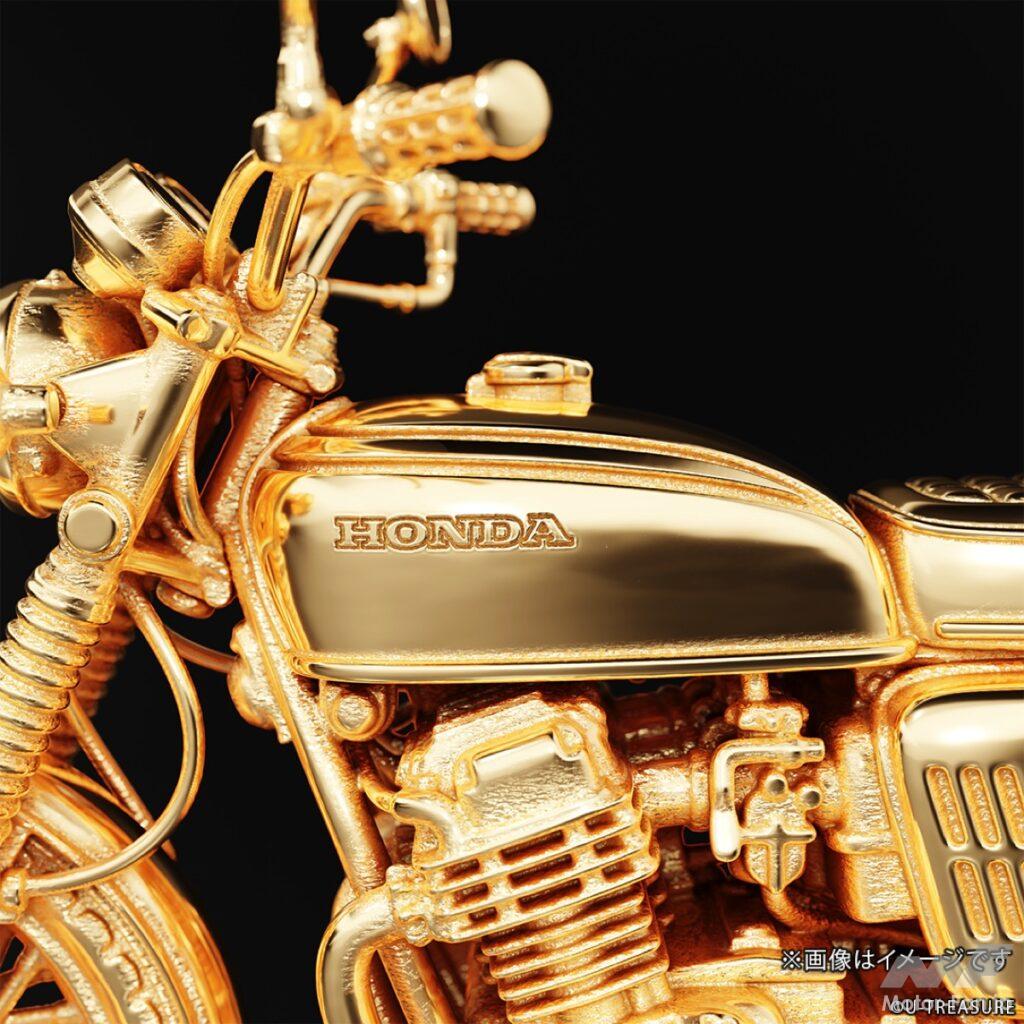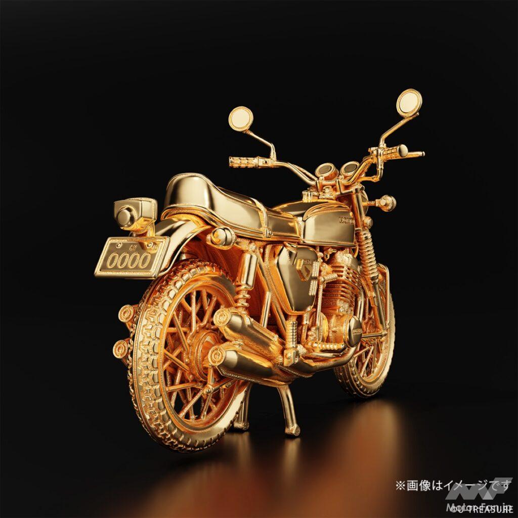 このフィギュアは、シルバー925(一部イエローゴールドコーティング/マット加工)を素材に使用し、ジュエリー職人が一部ずつ丁寧に仕上げた逸品。角張ったサイドカバー、ガソリンタンク、シート、フェンダー、フロントフォークといった主要パーツだけでなく、キャブレター、燃料コック、エアクリーナー、ワイヤー類などの細部まで、実車を徹底調査して忠実に再現している。