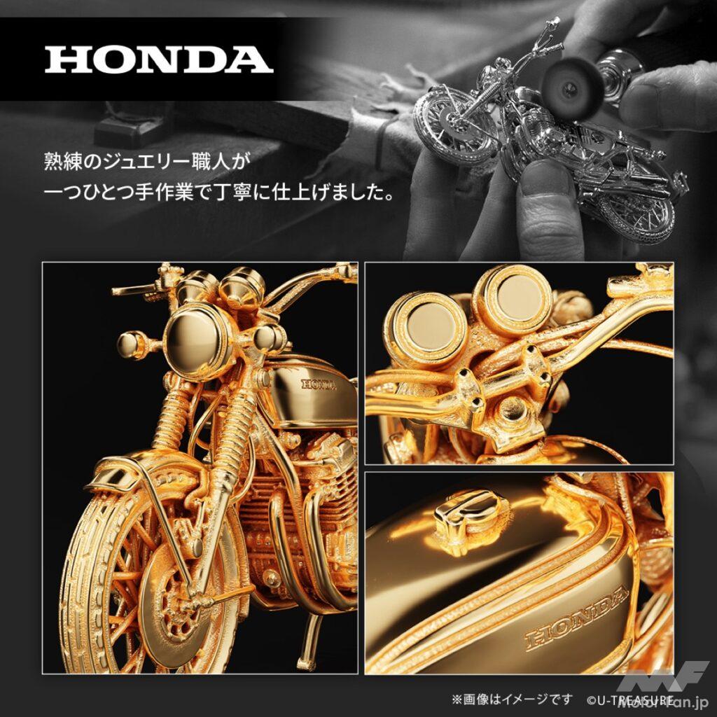 CB750FOUR K0は“Honda CB750 FOUR ‘69”として、現代に至るまで人気の高いクラシックモデル。Jun(e)などから1/12や1/4スケールのプラモデルも存在する中で、ユートレジャーの1/24銀製フィギュアは、モーターサイクル愛好家のみならず、アートやジュエリーの観点からも訴求する異例のコラボである。本田技研工業監修の信頼性もあり、“バイクを知る人にも知らない人にも驚きと感動を届けられる”製品として高い完成度を誇る。