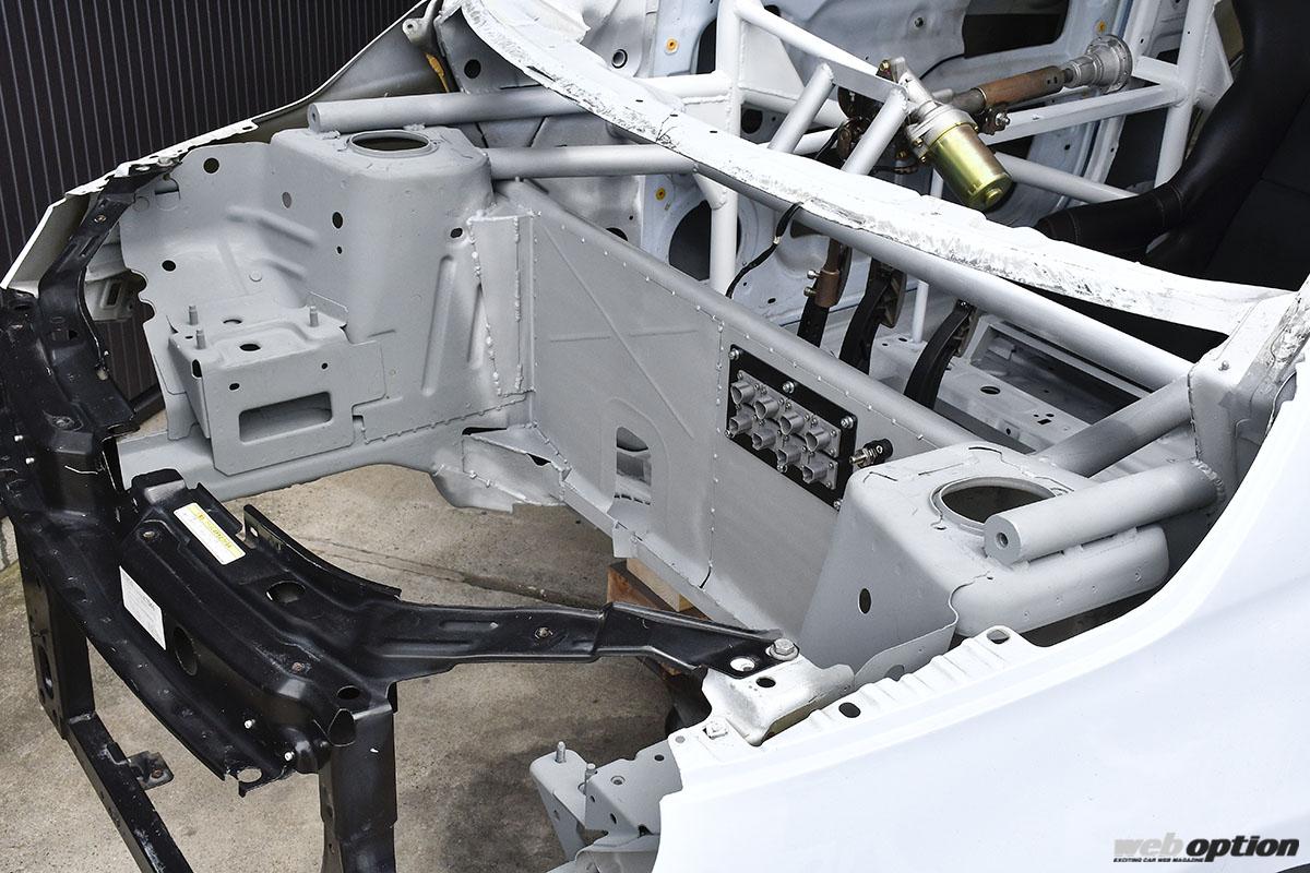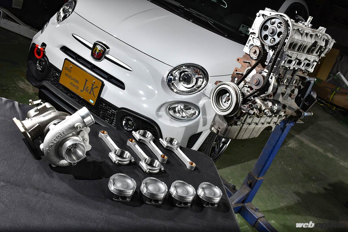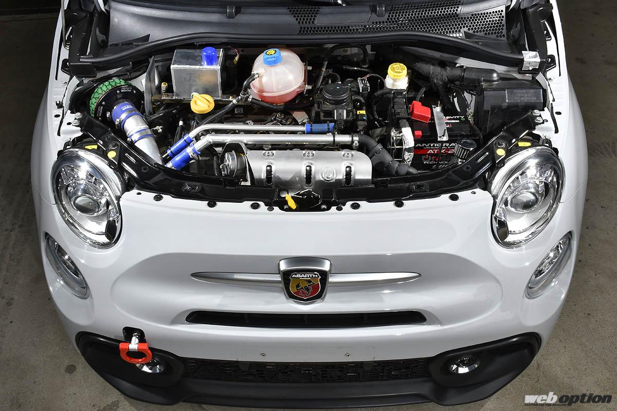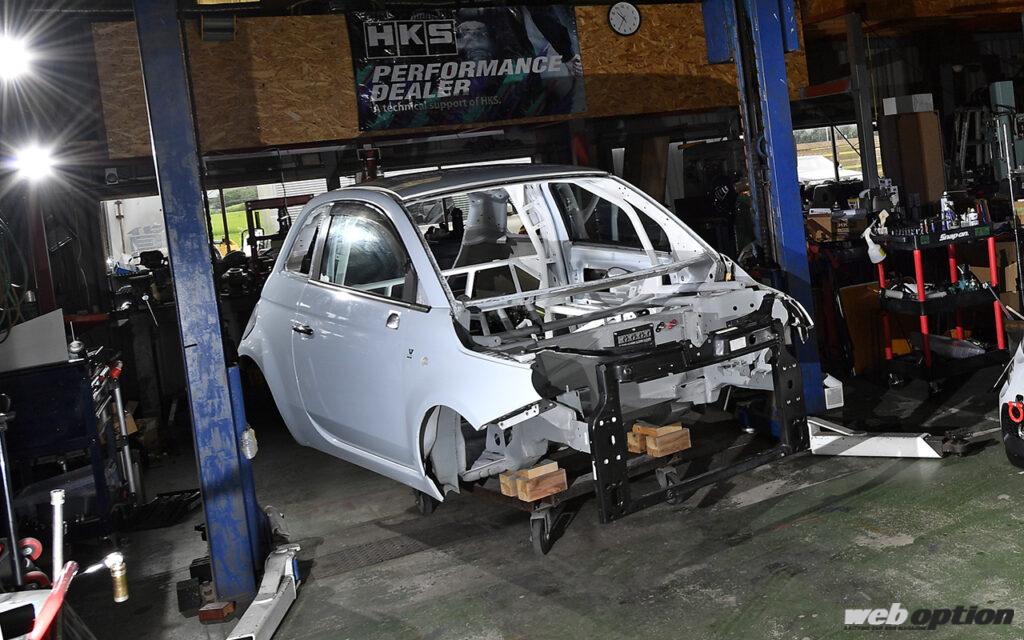 そんな若き2代目がスタートさせた独自プロジェクトが、アバルトタイムアタック仕様の製作。その志は高く、目標として掲げるのは“筑波FF最速”。つまり、HKSが手掛けたZC33S型スイフトスポーツ“TRB-04”の記録(K14C搭載時:57秒480/4G63搭載時:55秒498)を塗り替えるというものだ。