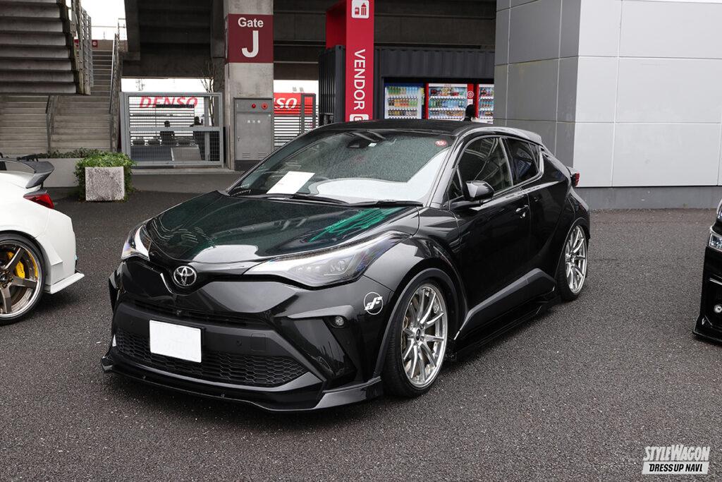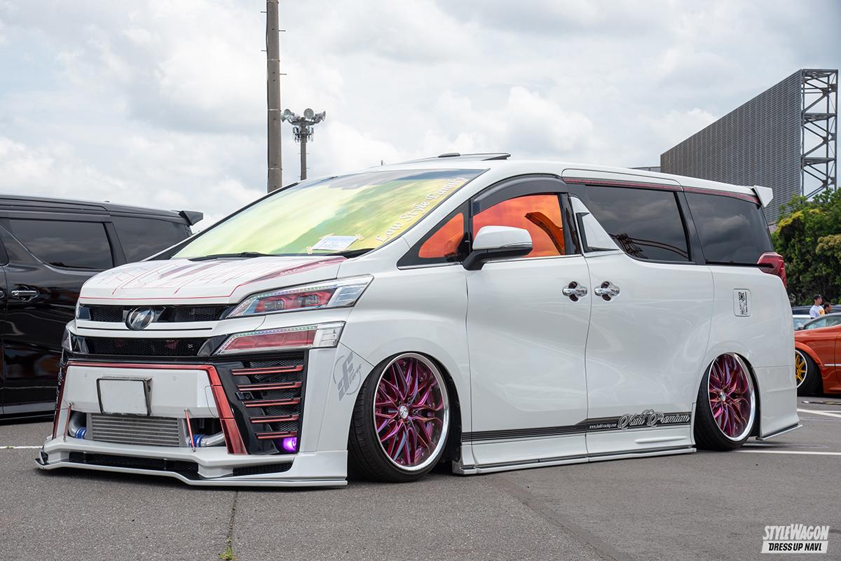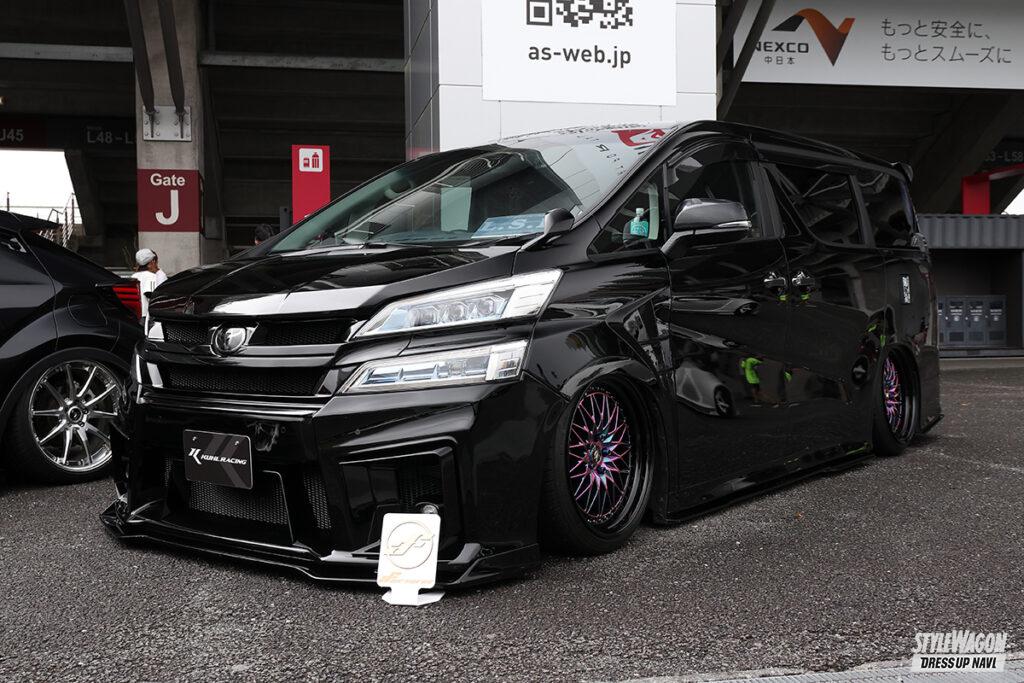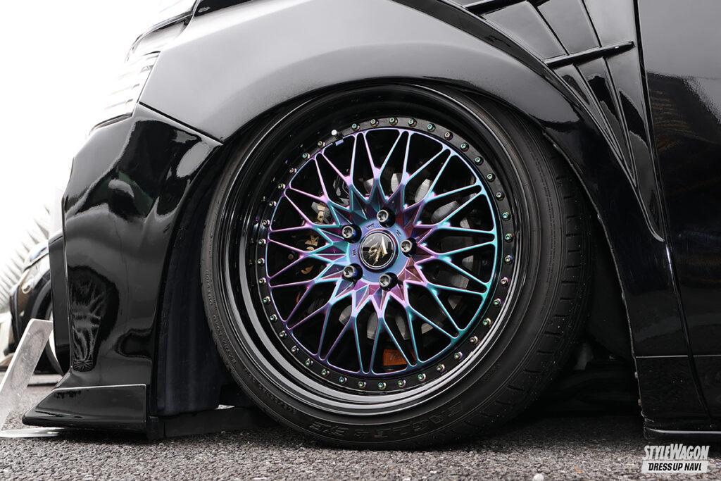 「前は30の“後期の前期”に乗っていて、純正+ダウンサス、TRDのエアロをつけていた。元々はバネをエアサスに換えたくてクールに行ったんです」と話す大河原さん。そこでコンプリートカーを提案され、買取も頑張ってくれたのでコチラに乗りかえた! 当車の見どころはホイール。存在しないハズの、マジョーラのように角度により色を変える特殊色仕様なのだ。本来『VS-XV』では対応不可な色なのだが……。黒一色コーデの中で、凄みを見せつける部分だ!!