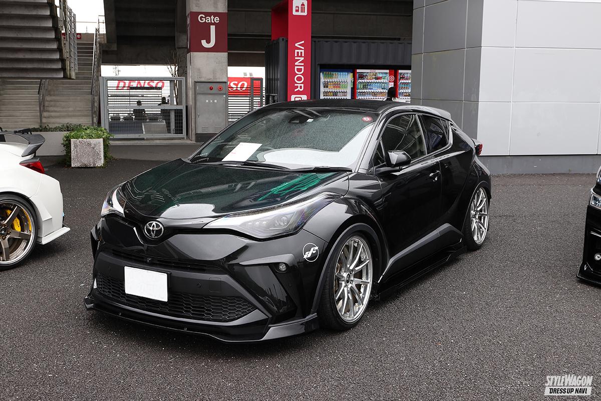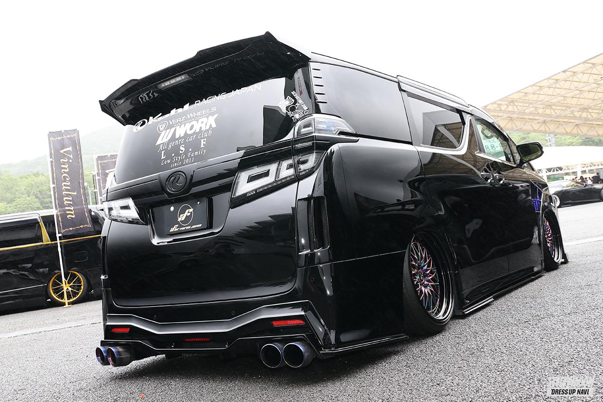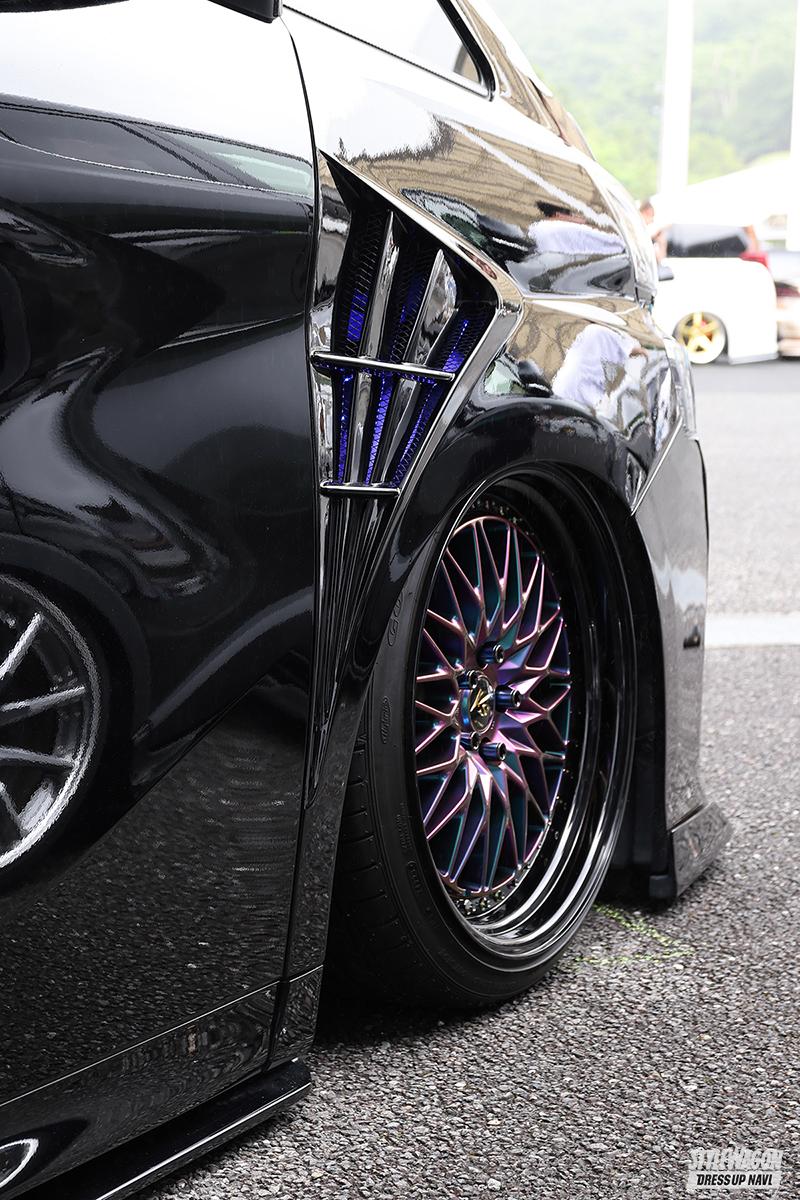 「前は30の“後期の前期”に乗っていて、純正+ダウンサス、TRDのエアロをつけていた。元々はバネをエアサスに換えたくてクールに行ったんです」と話す大河原さん。そこでコンプリートカーを提案され、買取も頑張ってくれたのでコチラに乗りかえた! 当車の見どころはホイール。存在しないハズの、マジョーラのように角度により色を変える特殊色仕様なのだ。本来『VS-XV』では対応不可な色なのだが……。黒一色コーデの中で、凄みを見せつける部分だ!!