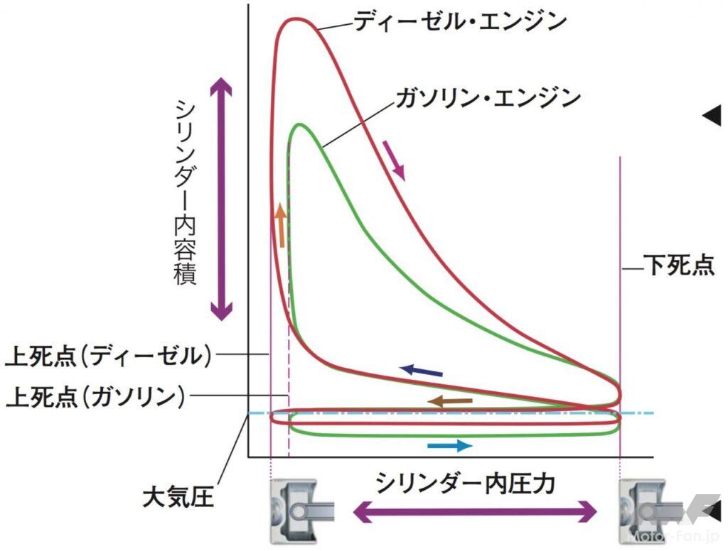 ガソリンエンジンとの違いをP-V線図で見てみよう。シリンダーの容積(ピストンのストロークによって変化)を横軸、シリンダー内圧力を縦軸にとって、熱サイクルを図示したものがP-V線図(圧力:容積Pressure-Volume線図)だ。