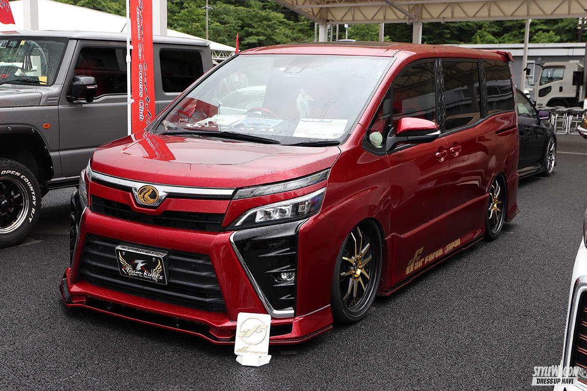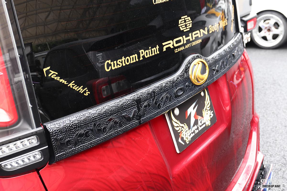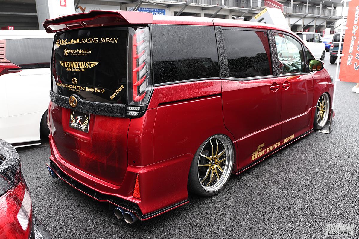 真っ赤なボディ色に、グラインダータトゥ、エングレービングといったカスタムペイントなどで、インパクト抜群の80ヴォクシー。元々クールのデモカーだったものを購入して自分仕様にバージョンアップしている。オーナーのお気に入りはリアまわりで、前述のカスタムペイントがハッキリわかりやすくなっている。シートも赤のスポーツシートを奢るなど、“赤”を象徴的に魅せている1台だ。