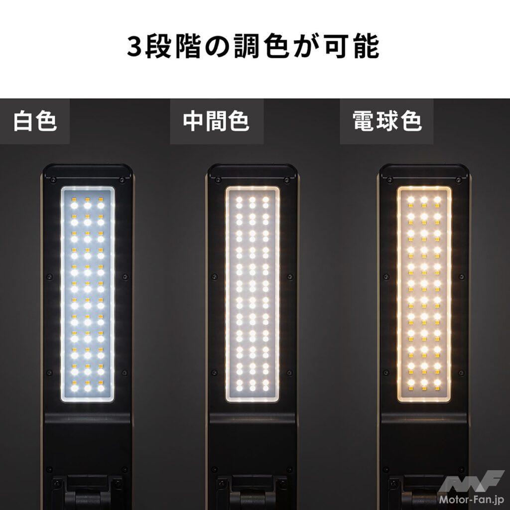 このライトは色温度も3段階に切り替え可能。3000Kの電球色は暖かみのある光でリラックス空間を演出し、4500Kの昼白色は自然光に近く作業にも適している。6000Kの昼光色は青白い光で視認性を高め、細かい作業や暗所での使用に最適だ。これらをスイッチ操作ひとつで簡単に切り替えられる。