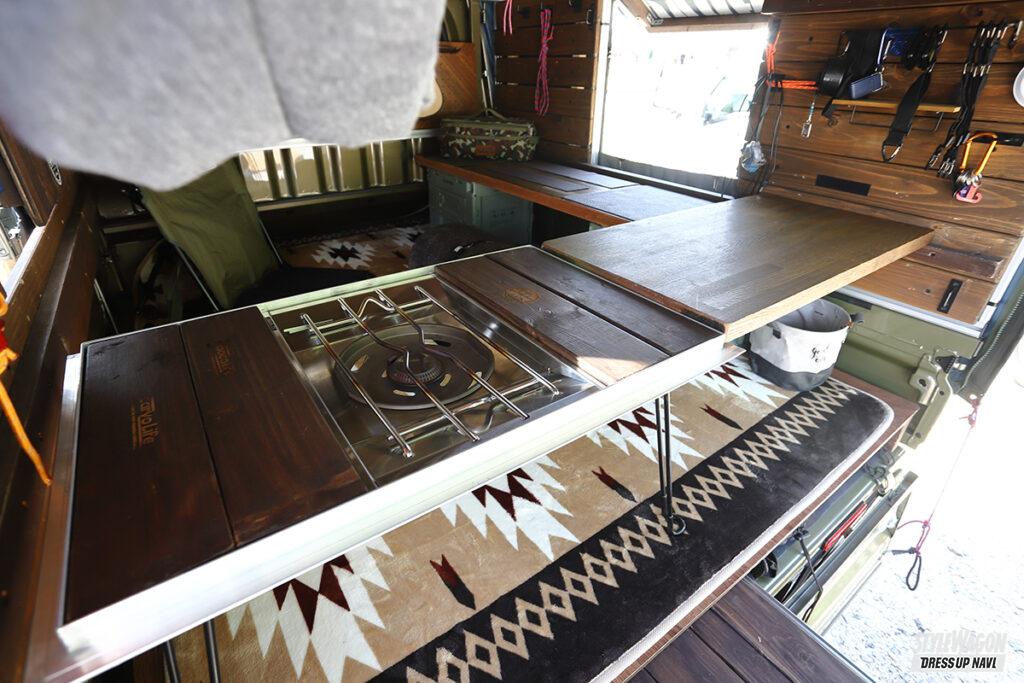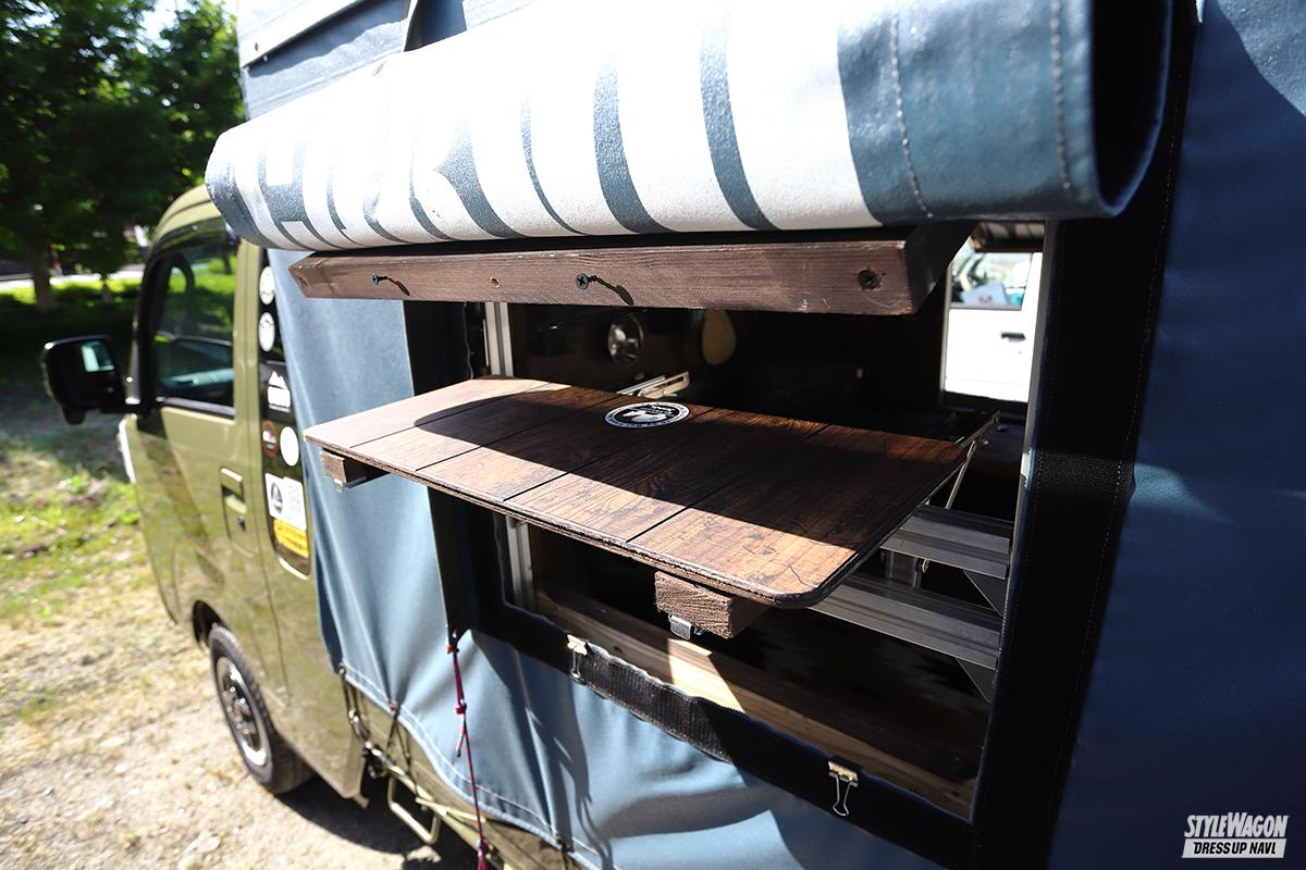 今回のイベントの主催者であり、ハイゼット&ハイゼットジャンボの2台でエントリーしたCNLさん。まずはジャンボだが、こちらは当初キャンピングカー狙いもコストを考えてジャンボ×Carvo(幌キット)を選択。「Carvoにすることで居住性も広く確保できる上、その空間も自分の好みに構築できるので選びました」。その気になるベッド部は床面を少し上げてスライドテーブルを設置。移動できるアルミテーブルなどを駆使することで外での飲食も同じ器具で楽しめるよう工夫がなされているのだ。