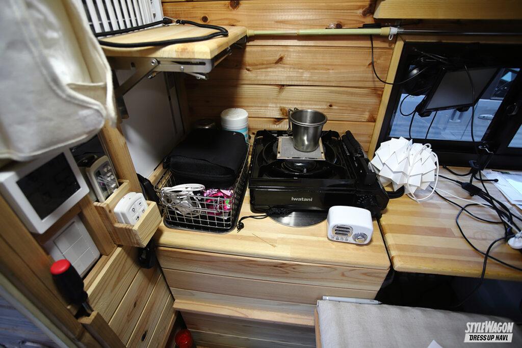 キャリイトラックに載せたシェルからトレーラーに積載しているサウナ。他にも細かなモノまでDIYで手がける芳彦さんのお仕事は兼業農家さん。アウトドアの予定を立て、出かける前にシェルを載せて出かけるそうだ。その気になるシェルの外板は杉のはめ板を使っており、「少し焼きすぎなくらい焼いて、木々の隙間にはコーキング剤をこれでもか、と塗り広げています。下の方が白くなっていますが、それも味ということで」。今回は同僚の上野さんと共にキャンプ(サウナは初披露)にやってきたのだ。