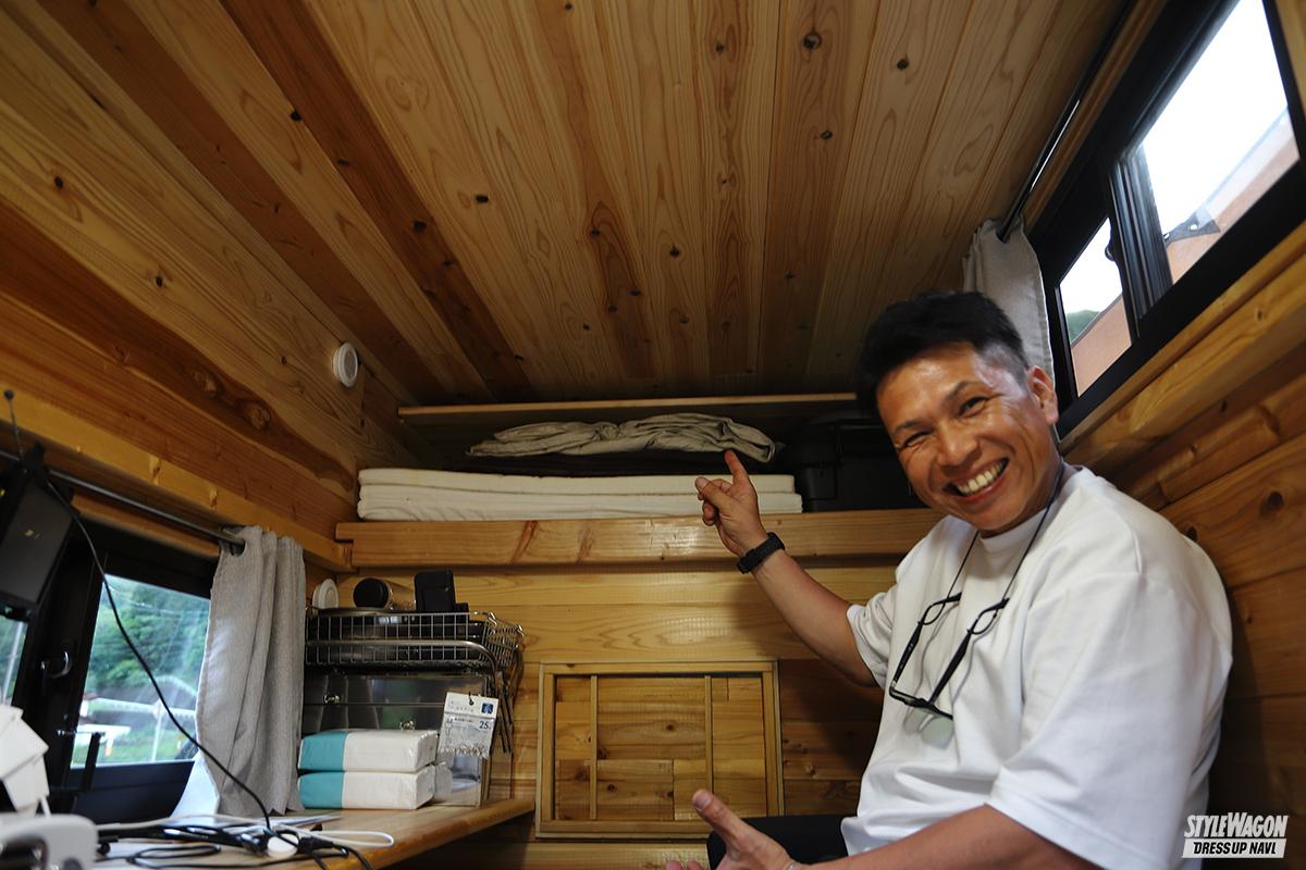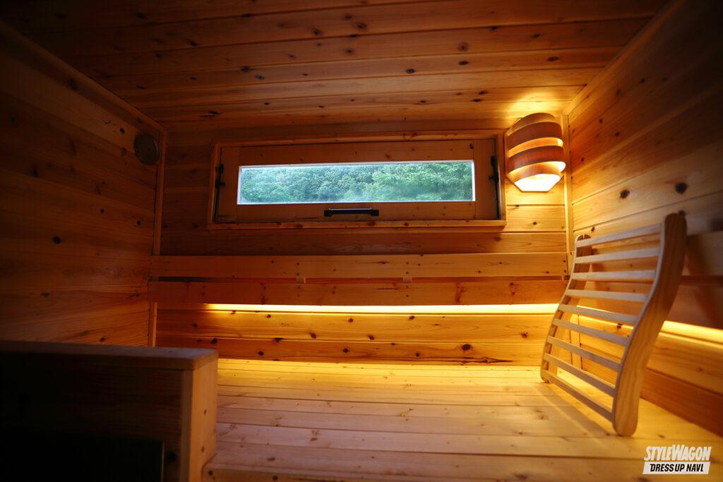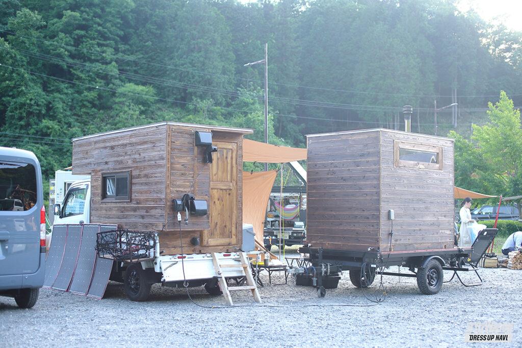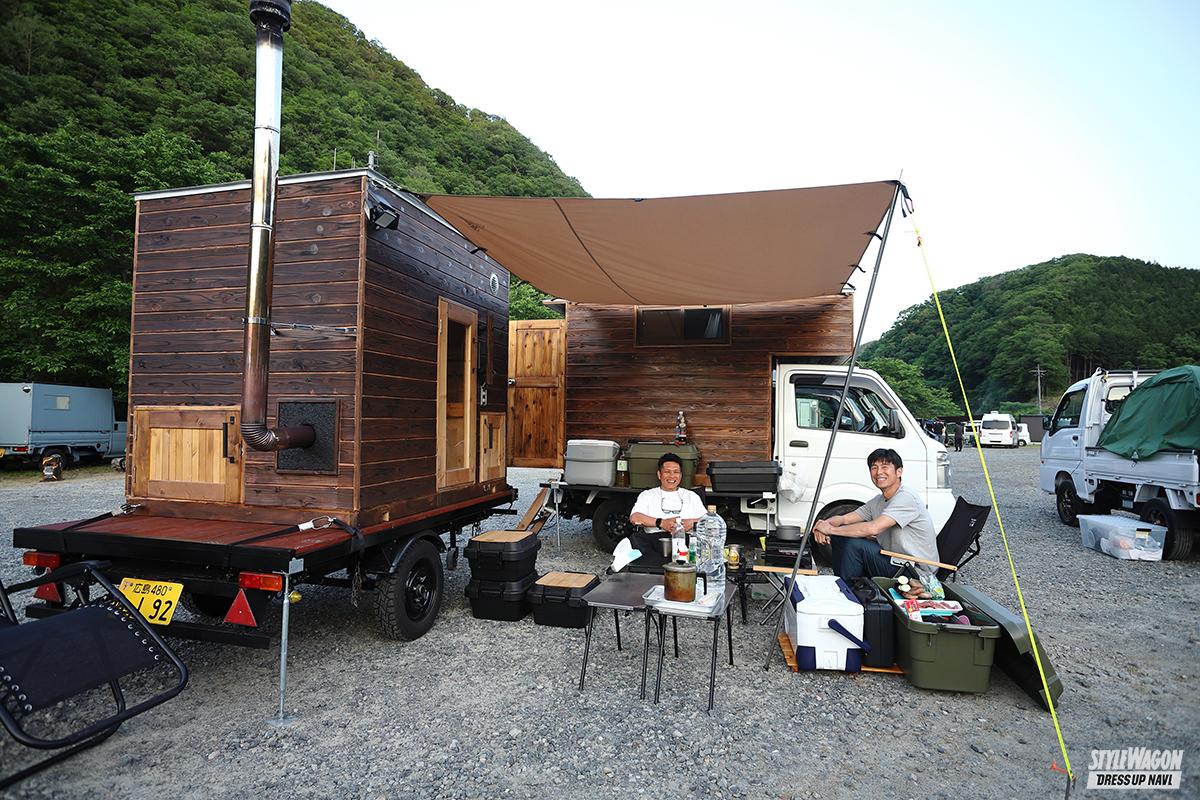 キャリイトラックに載せたシェルからトレーラーに積載しているサウナ。他にも細かなモノまでDIYで手がける芳彦さんのお仕事は兼業農家さん。アウトドアの予定を立て、出かける前にシェルを載せて出かけるそうだ。その気になるシェルの外板は杉のはめ板を使っており、「少し焼きすぎなくらい焼いて、木々の隙間にはコーキング剤をこれでもか、と塗り広げています。下の方が白くなっていますが、それも味ということで」。今回は同僚の上野さんと共にキャンプ(サウナは初披露)にやってきたのだ。