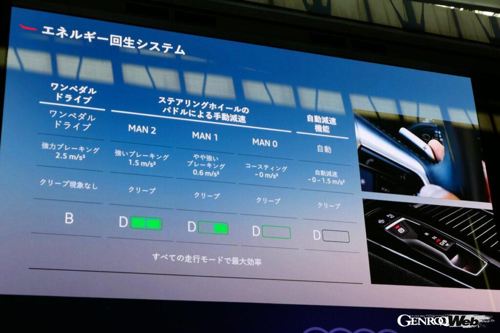 特筆すべきはその航続距離で、もっとも標準的なモデルの「A6 スポーツバックe-tronパフォーマンス」でレンジプラスパッケージ(エアサス、バーチャルエクステリアミラーなど)を選択すると最大846km(WLTP)に達するという。これは全モデルに搭載される総電力量100kWhのリチウムイオンバッテリーも貢献するが、全長5mのミドサイズサルーンとしては優秀な電力消費率127Wh/km(7.8km/kWh)という数値の賜物でもある。ちなみにラインナップ中、最もベーシックなA6 スポーツバック e-tronパフォーマンスの通常航続距離は769km(WLTP)、同アバントでも734kmを実現している。一方、前後2基のモーターで4輪を駆動するクワトロシステムを搭載する「S6 e-tron」の航続距離は、スポーツバックが726km、アバントが706kmとなっている。