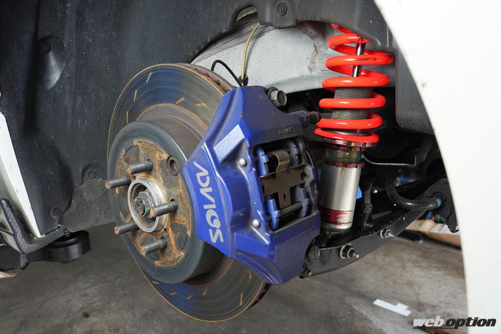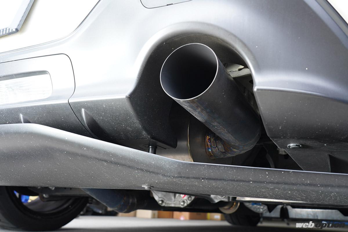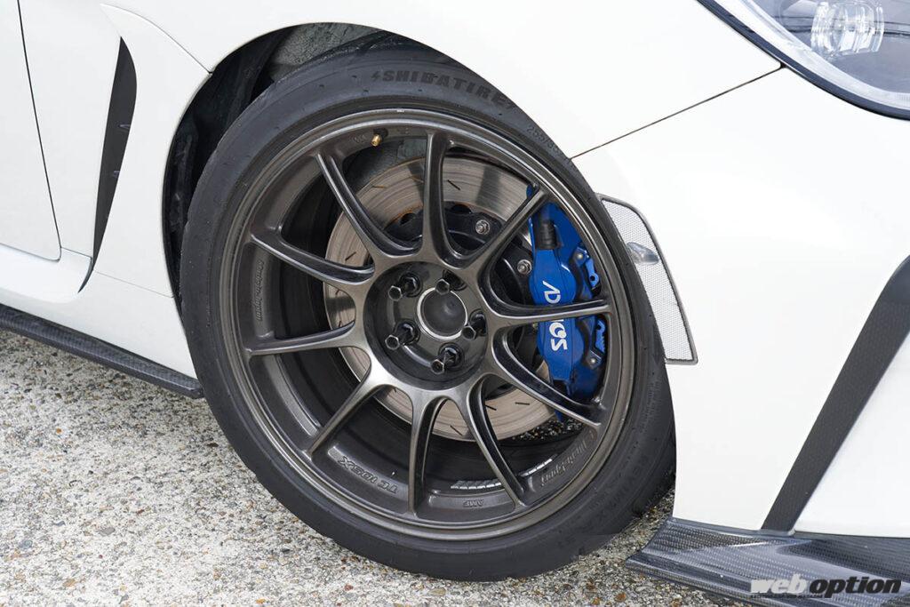 デモカーのホイールはウェッズスポーツTC105X(9.5J+45×18)で、ブレーキにはアドヴィックスのキットを使用。マフラーはマシンに合わせたスペシャル品を備えている。