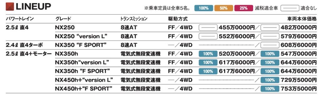 激戦区ゆえかパワートレインの選択肢が多いのもNXの魅力だ。安価な2.5ℓ自然吸気の「250」から2.4ℓターボの「350」、トヨタ/レクサスの定番ともいうべき2.5ℓハイブリッドの「350h」、同プラグインの「450h+」という布陣だ。さらに250と350hではFFと4WDが選べる(350と450h+は4WDのみ)。