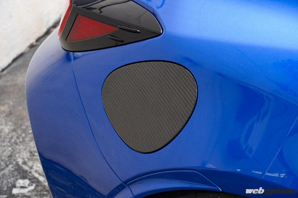 ドライカーボン製の給油口カバー(1万6500円)も、貼るだけのイージー取り付けが嬉しい。こちらもクリア塗装仕上げ。