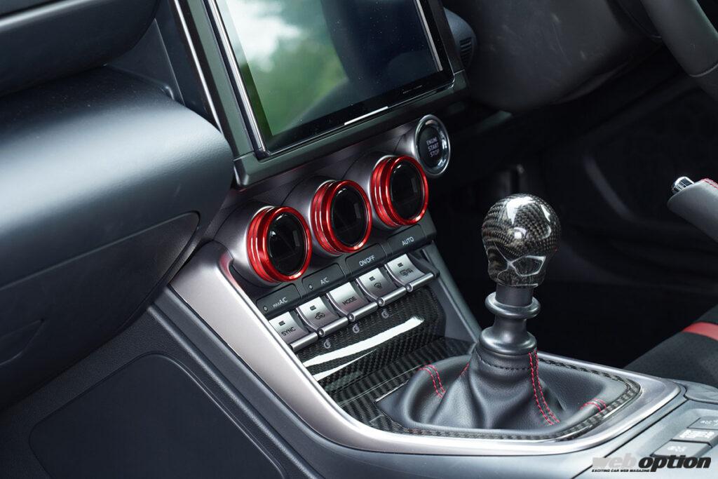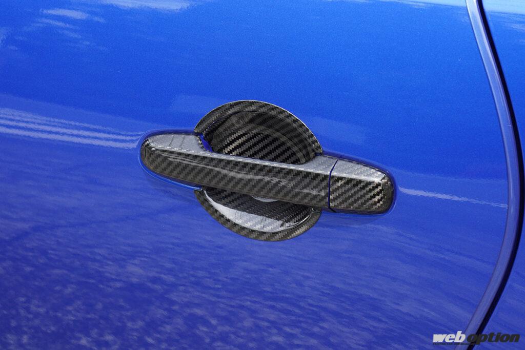 カーボン調のドアハンドルパネル(8800円)は人気アイテム。製品は内側パネルまでカーボン仕上げとなるモデル(8800円n)と、縁取り部分のみをカーボン調に仕立てたモデル(6600円)の2種類。ABS樹脂素材で、もちろんGR86/BRZ共通品だ。