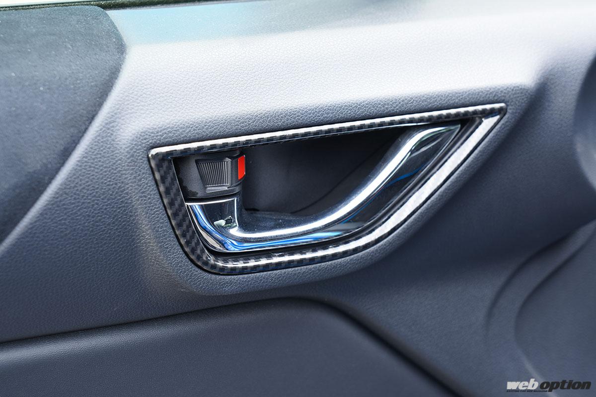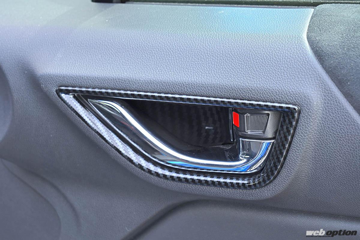カーボン調のドアハンドルパネル(8800円)は人気アイテム。製品は内側パネルまでカーボン仕上げとなるモデル(8800円n)と、縁取り部分のみをカーボン調に仕立てたモデル(6600円)の2種類。ABS樹脂素材で、もちろんGR86/BRZ共通品だ。
