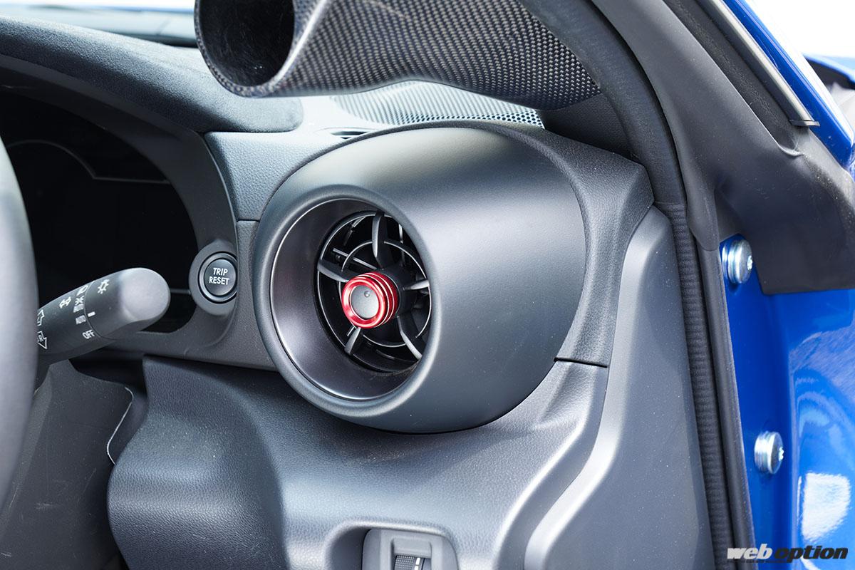 コクピットのアクセントとして有効な3連のエアコンダイヤルカバー(6600円)。素材はアルミ製のレッドアルマイト仕上げだ。レッドアルマイトのカラーがビジュアルインパクトを与える、エアコン吹き出し口のダイヤルカバー(3300円)も設定。