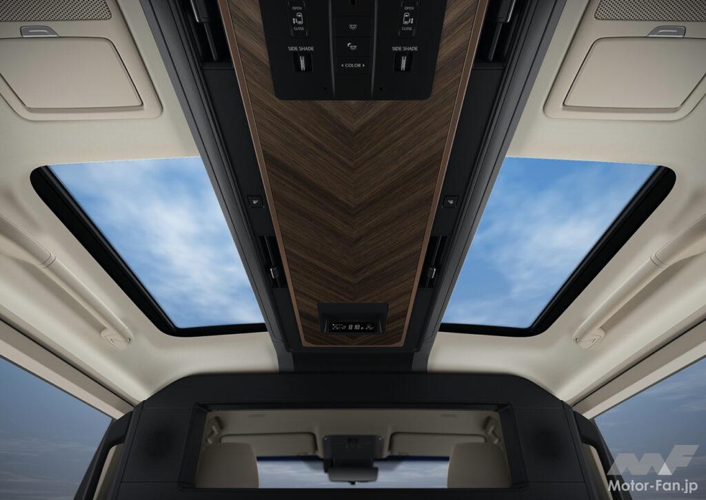 左右独立式のサンルーフとビジネスジェットを模したセンター配置のオーバーヘッドコンソールも同様。ただし、その配置はアルファード/ヴェルファイアとLMでは異なるようだ。特にLMの4名乗車仕様は操作系がかなり後ろ寄りに配置されている。