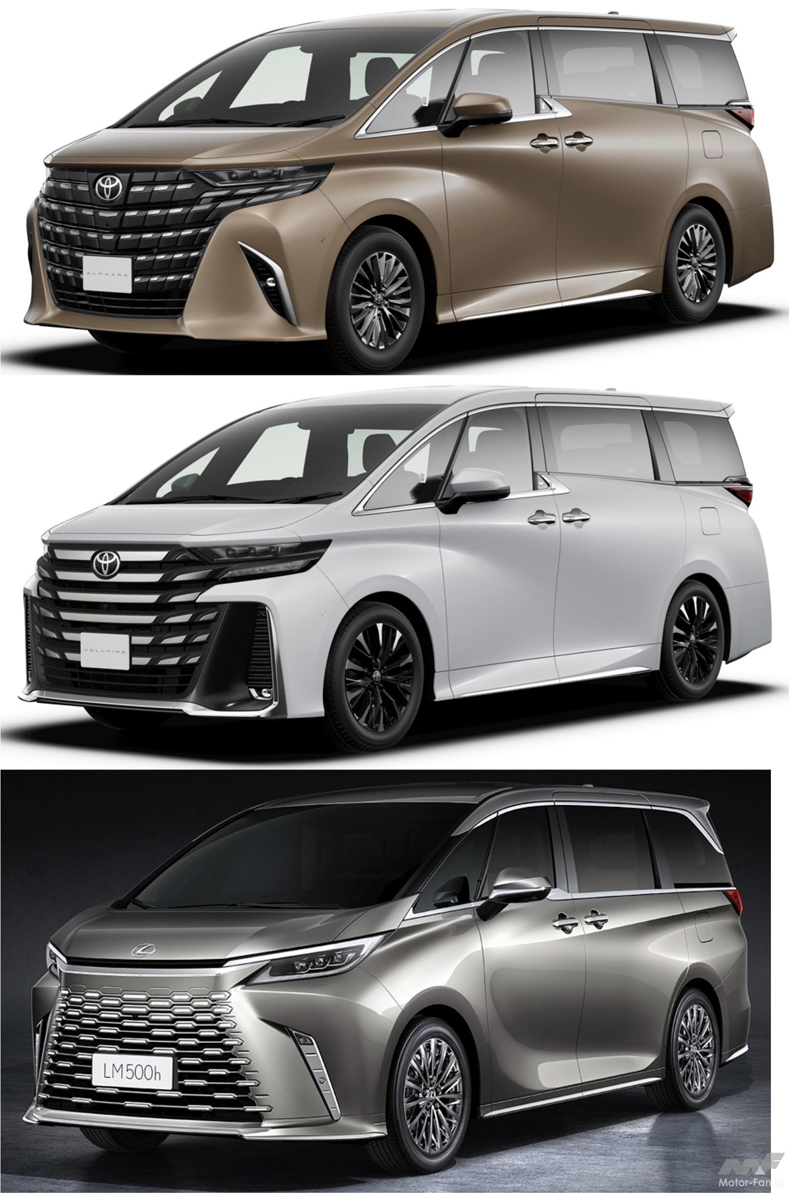 ミニバンということもあり、そのフィルムに大きくな違いはないが、フロントマスクはアルファード/ヴェルファイアの上に広がる形に対して、LMはレクサスのファミリーフェイスを踏襲した末広がりのフロントグリルを備える。