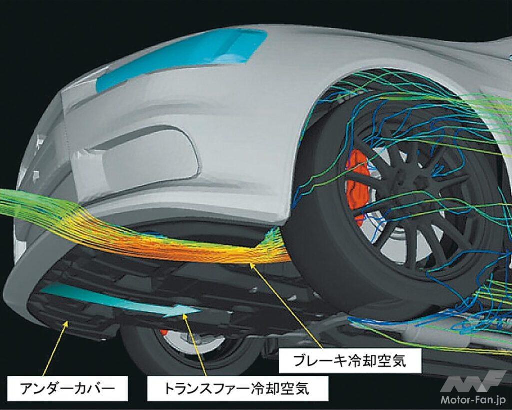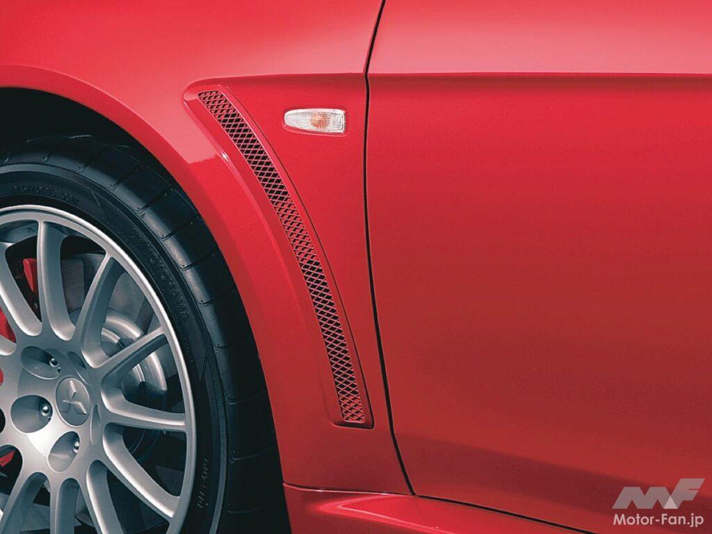 たとえば、ランサーエボリューションXの例では、高出力過給エンジンの熱をうまく逃がすためエンジンルームは下面を含めた4面を利用している。最高出力時の発生熱量にも負けない排熱量を計算し、それを得るためにあらゆる部位を利用するという考え方だ。しかし、ほかの部分の気流を乱さずに熱をうまく逃がすことはなかなか難しい。ボディの造形作業と同時に熱対策を進め、風洞実験とシミュレーションを繰り返しながら目標値を達成させるという地道な作業が行われた。開いている「穴」のすべてに意味がある。